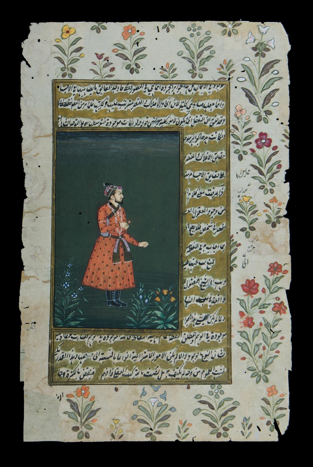 2 Mughal Illuminated Book Pages. Portraits of nobleman & lady, with floral borders & nasta'liq calligraphy. Script verso to each. Gouache, Ink & Gilt (2) 25x16cm (each) Estimate $250-450