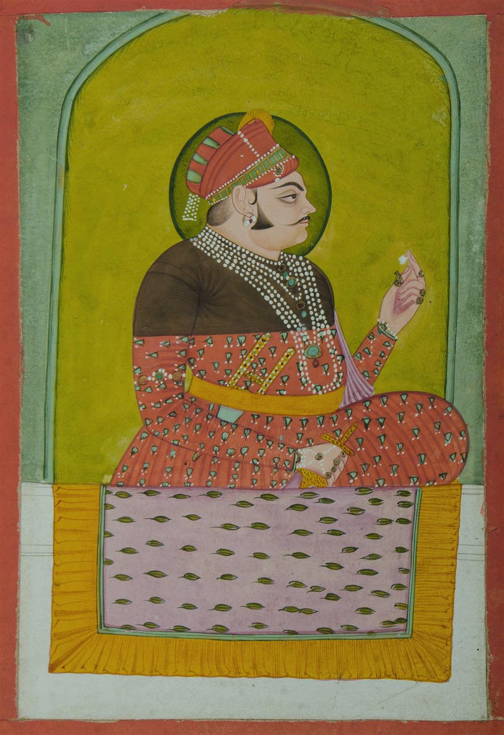 Indian School, Portrait of an Emperor Admiring a Jewel Gouache, Ink & Gilt on Card 24x17cm Estimate $180-300