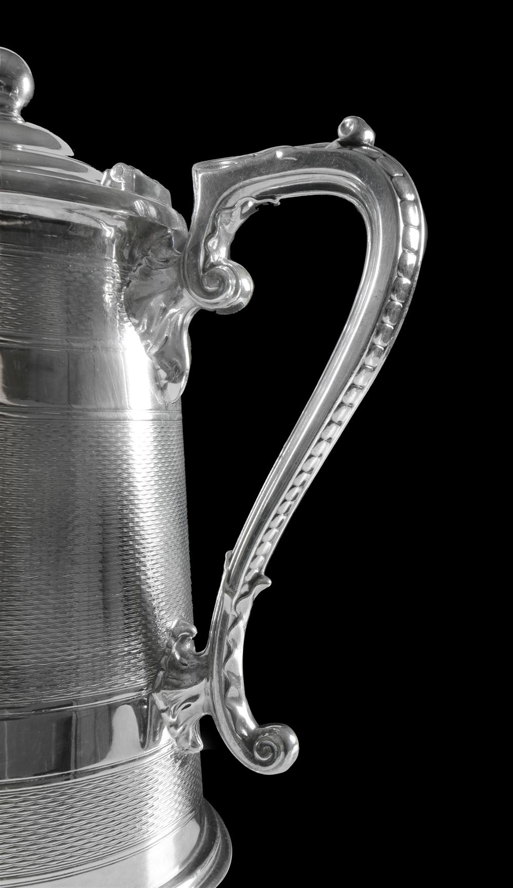 Edwardian Silver Plate Presentation Jug. By James Dixon & Sons. Tapering covered jug with ball finial & acanthus decorated handle. Spout cover missing. H30cm Estimate $60-100