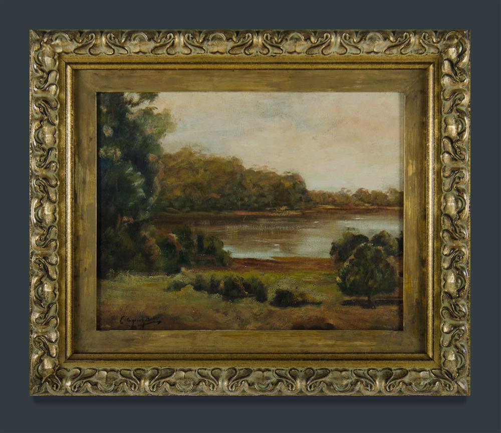 BAKER, Christina Asquith (1869-1960) River Landscape, likely the Yarra Provenance: Angeloro family collection. Oil on Board 4x44cm Estimate $600-1,000