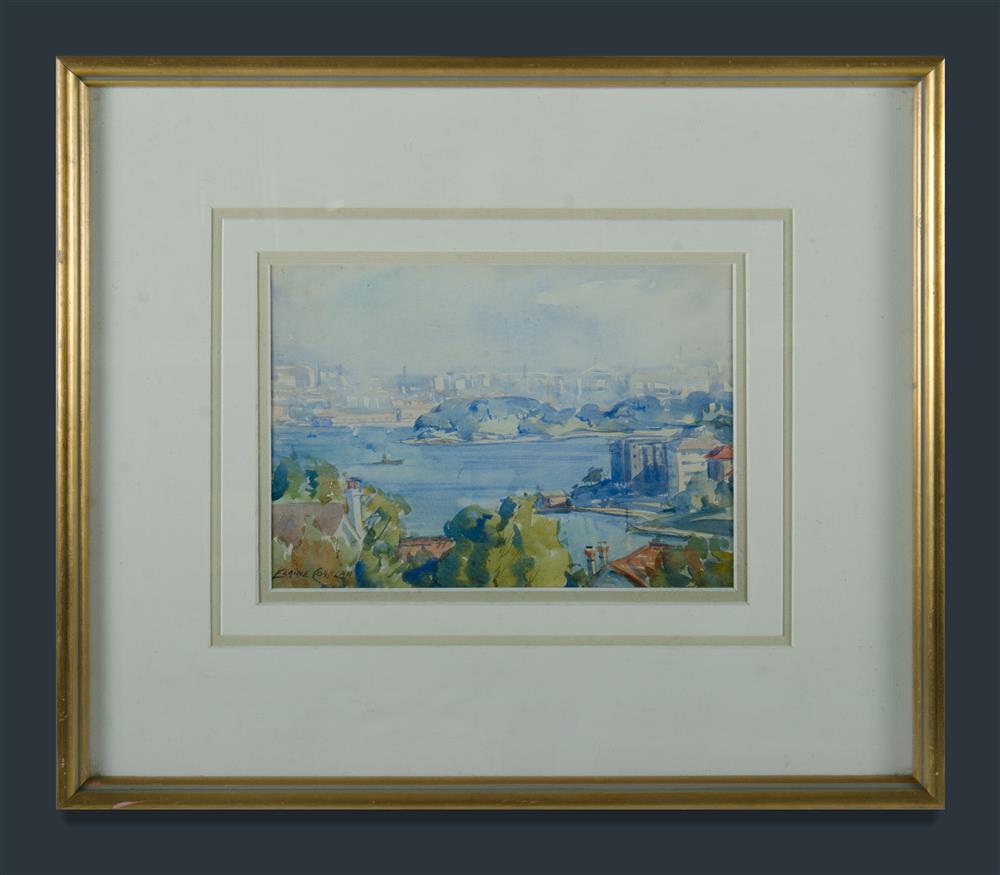 COGHLAN, Elaine (1897-1989) Sydney Harbour from Cremorne, c1940. Provenance: Angeloro family collection. Literature: Illus. 'Heritage: The National Women's Art Book,' Sydney 1995. W/Clr 17x25cm Estimate $250-450