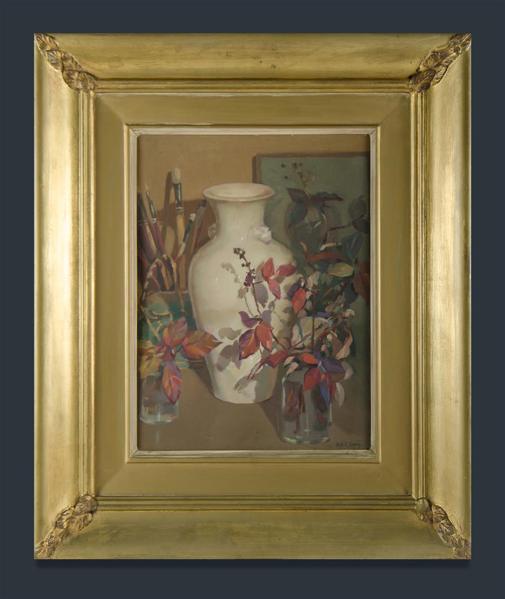 CRAIG, Sybil (1901-1989) 'Chinese Jar and Black-Berry Leaves,' 1934. Label verso for Gowrie Galleries. Provenance: Angeloro family collection. Oil on Canvas Board 37x27cm Estimate $800-1,200