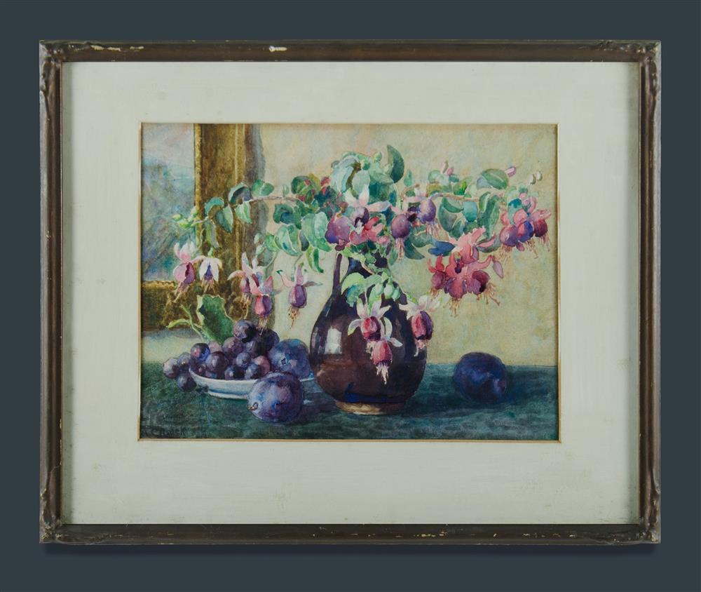 CUSACK, Aline (1867-1949) Still Life with Fuchsia, Plums & Grapes Provenance: Angeloro family collection. W/Clr 27x36cm Estimate $300-500