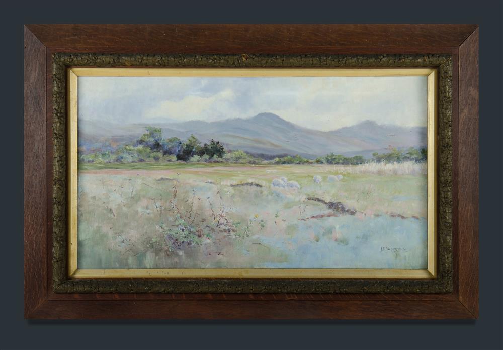 SCARVELL, Jessie (1862-1950) Sheep Grazing, possibly Pages River, Murrurundi NSW, 1898 Remnants of original framer's label, H W Callan, George St Sydney. Provenance: Angeloro family collection. Oil on Canvas 50x89cm Estimate $600-1,000