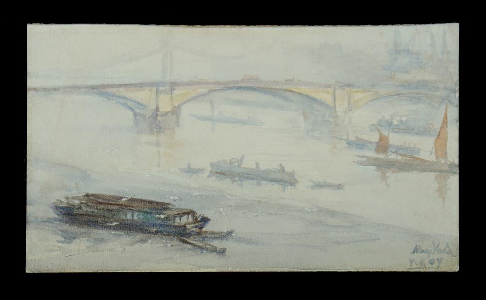 VALE, May (1862-1945) 'New Battersea Bridge & Chelsea Reach from Cheyne Walk, Chelsea,' 1907 Painted during the artist's second trip to London where she took over Arthur Streeton's former studio nearby. Provenance: Angeloro family collection. W/Clr on Card 13x23cm Estimate $100-200