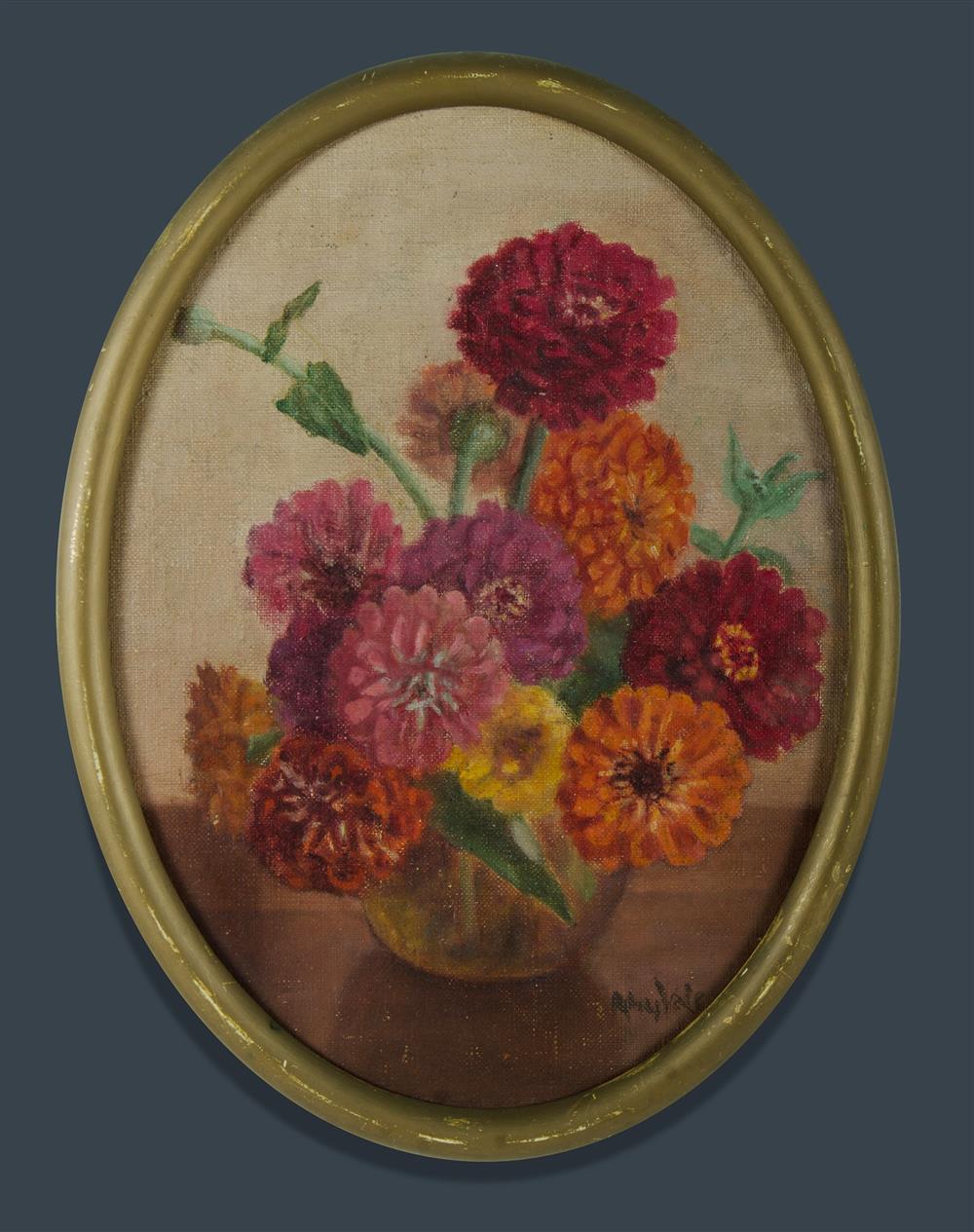 VALE, Amy (1874-1951) Dahlias Provenance: Angeloro family collection. Oil on Canvas on Board 39x29cm (oval) Estimate $150-300