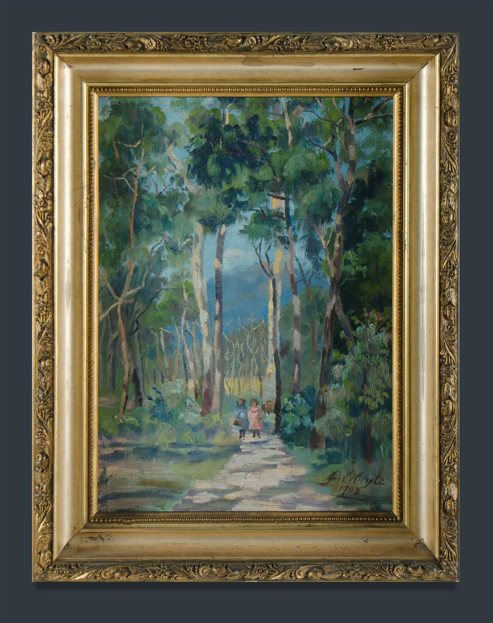 WHYTE, Janie Wilkinson (1869-1953) Children on a Bush Path, 1903 Provenance: Angeloro family collection. Oil on Board 34x24cm Estimate $250-450