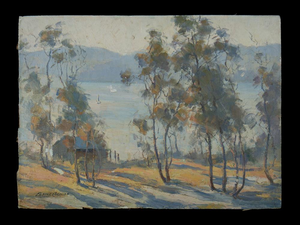 COGHLAN, Elaine (1897-1989) (2) Two Views of the Lane Cove River, Sydney Provenance: Angeloro family collection. Oil on Canvas on Board (2) 27x37cm & 25x33cm Estimate $400-700