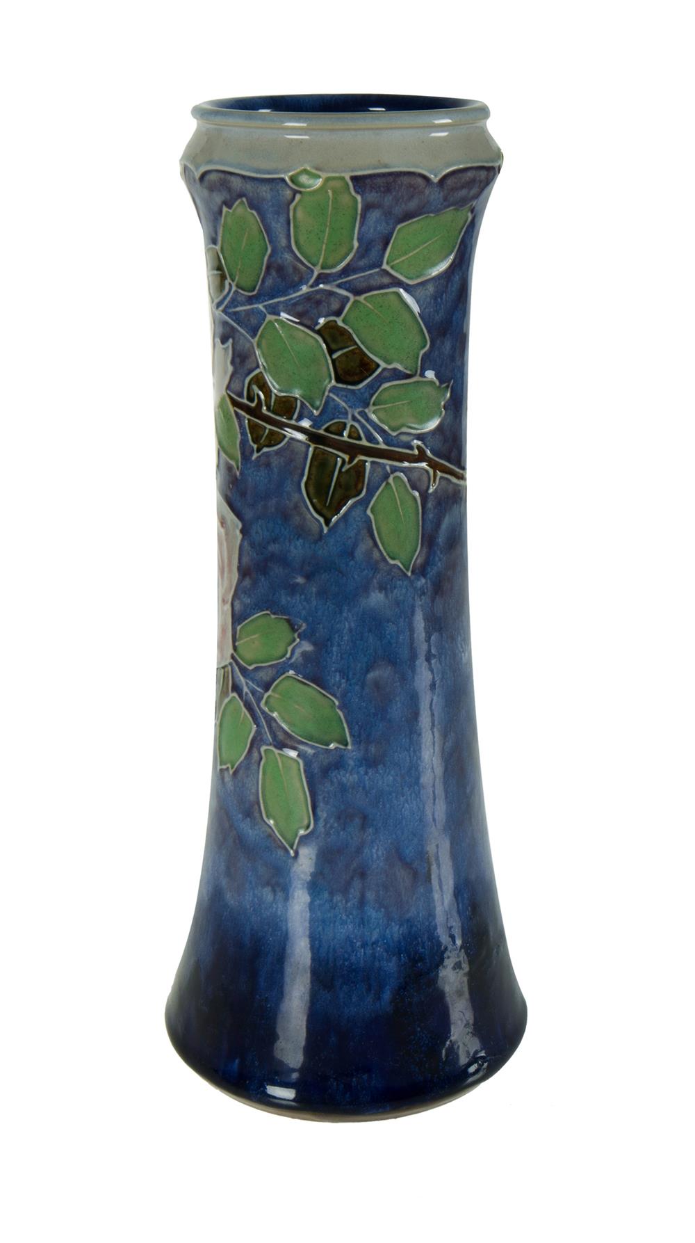 Royal Doulton Stoneware Vase. Of waisted, cylindrical form, with tube line decoration of roses. Incised potter's initials to base. Estimate $50-100