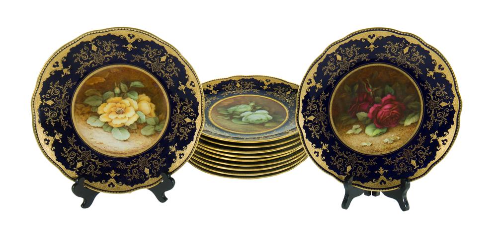 Set 15 Coalport Hand Painted Cabinet Plates. Each signed 'F Howard' & painted with roses. Floral gilt & cobalt borders. One restored, five with hairline cracks. Dia 23cm (each) Estimate $500-1,000
