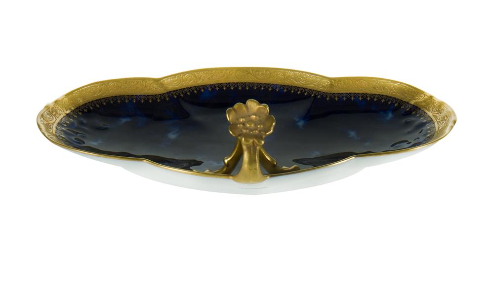 Limoges Tennis Cup & Saucer. Cobalt with heavy gilt encrusted borders. Floriform handles. L27cm Estimate $50-100