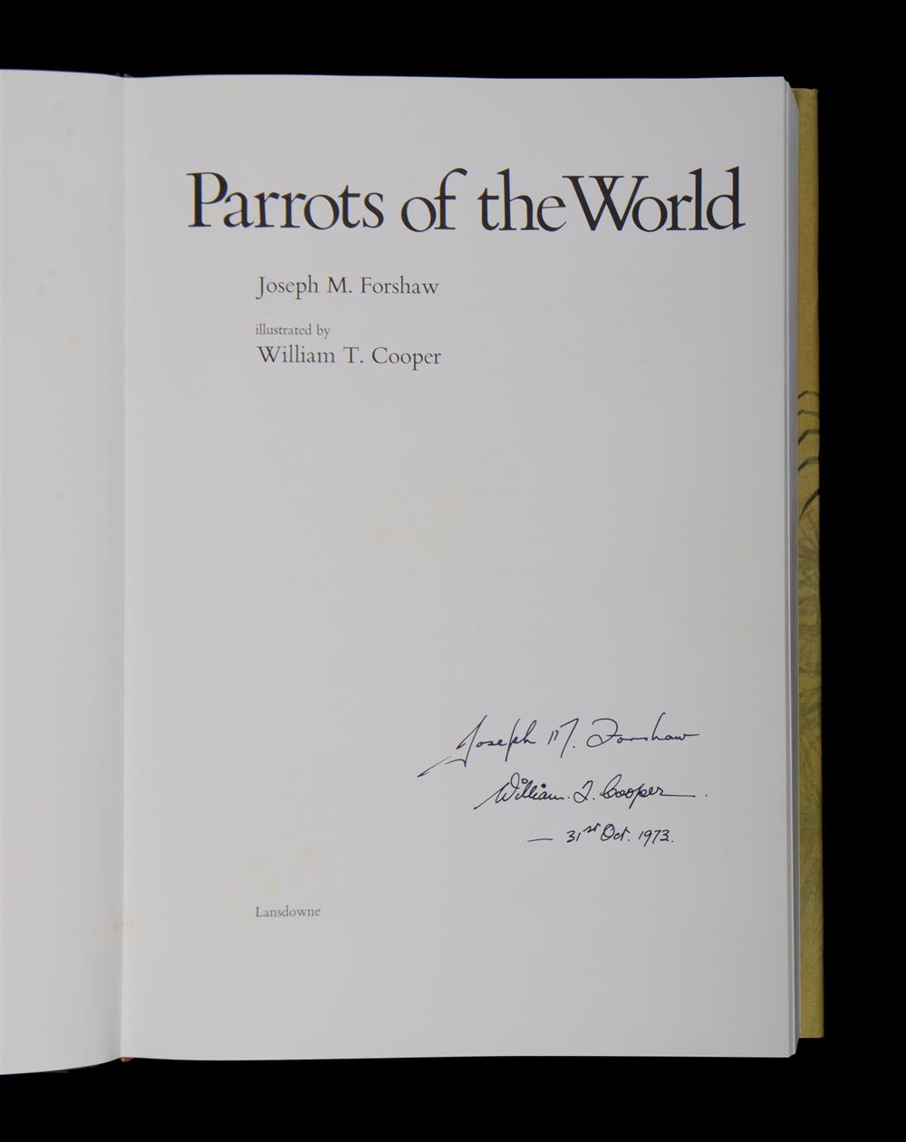 BOOKS (2), 'Parrots of the World,' 1973. By Joseph Forshaw, pub. Lansdowne Press. Signed by the author & illustrator; & 'The Birds of Paradise & Bower Birds,' 1977. By Joseph Forshaw, pub. William Collins Publishers. Estimate $150-250