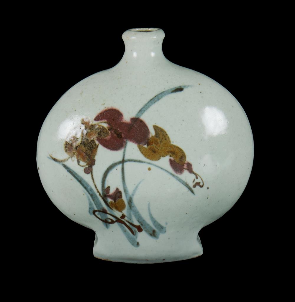 Australian Studio Pottery Moon Flask Vase. Stoneware vase with stylised floral decoration, possibly by Ivan Englund. H24cm Estimate $60-120