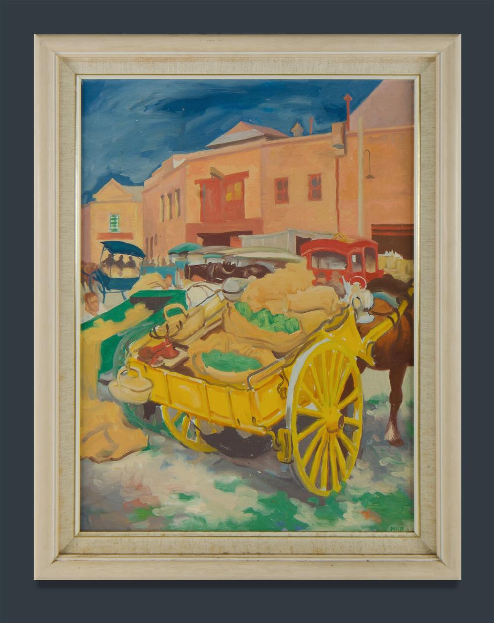BAKER, Normand Henry (1908-1955) Market Scene with Horse & Cart Oil on Canvas on Board 59x43cm Estimate $300-500