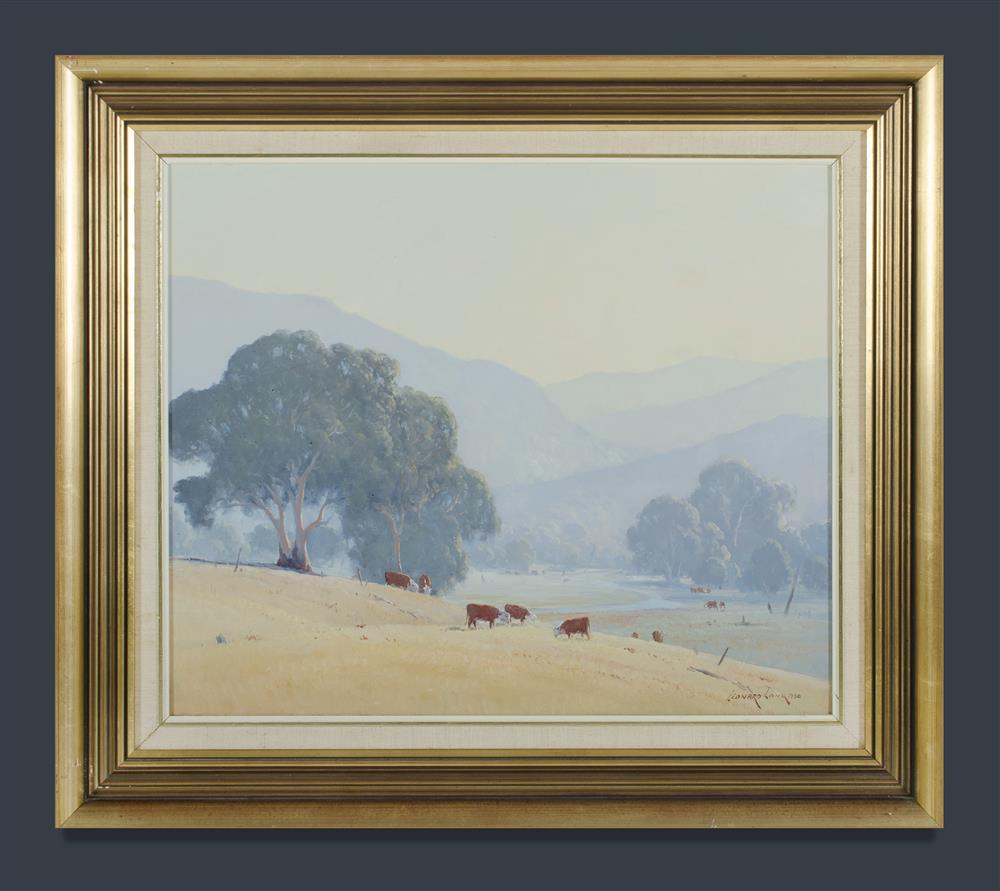 LONG, Leonard (1911-2013) 'Strath Creek Landscape, Victoria,' 1980. Greythorn Galleries, Victoria, label verso. Oil on Canvas Board 50x60cm Estimate $600-900