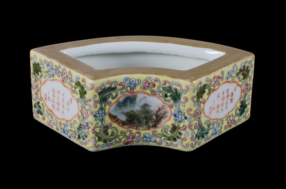 Fine Chinese Fine Porcelain Brushwasher. Fan form, with two small reserves painted with landscapes & two with inscriptions. Yellow ground with scrolling floral & leaf tendrils. Bears Yongzheng seal mark in red to base. (H4cm) Estimate $80-150