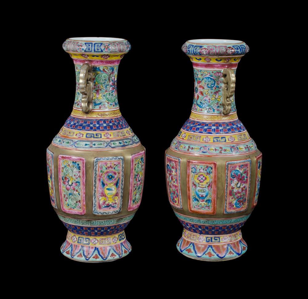 Pr Chinese Porcelain Vases. Each with twin stylised dragon handles. The body with eight floral panels. Bears underglaze blue Qianlong mark to base. (H21cm) Estimate $400-800