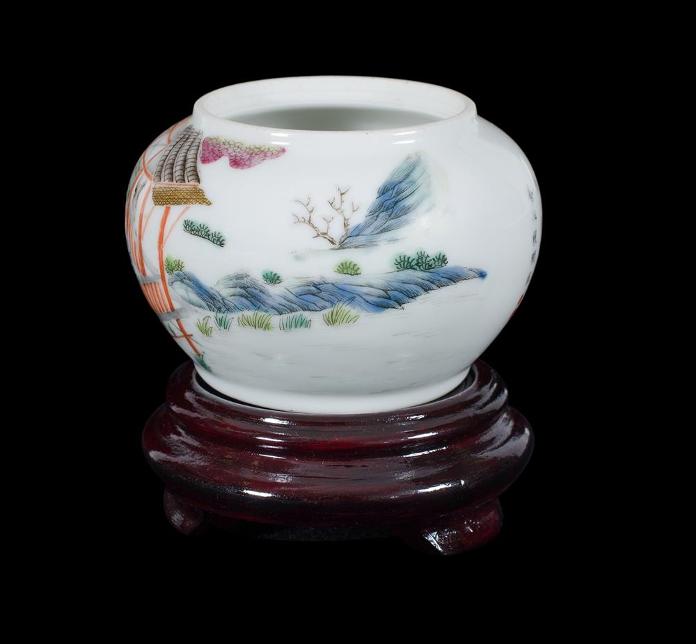 Chinese Porcelain Water Pot. With famille rose overglazed decoration of figures in a house. Six lines of script verso. Bears iron red Daoguang mark to base. (H5.5cm) Estimate $100-200