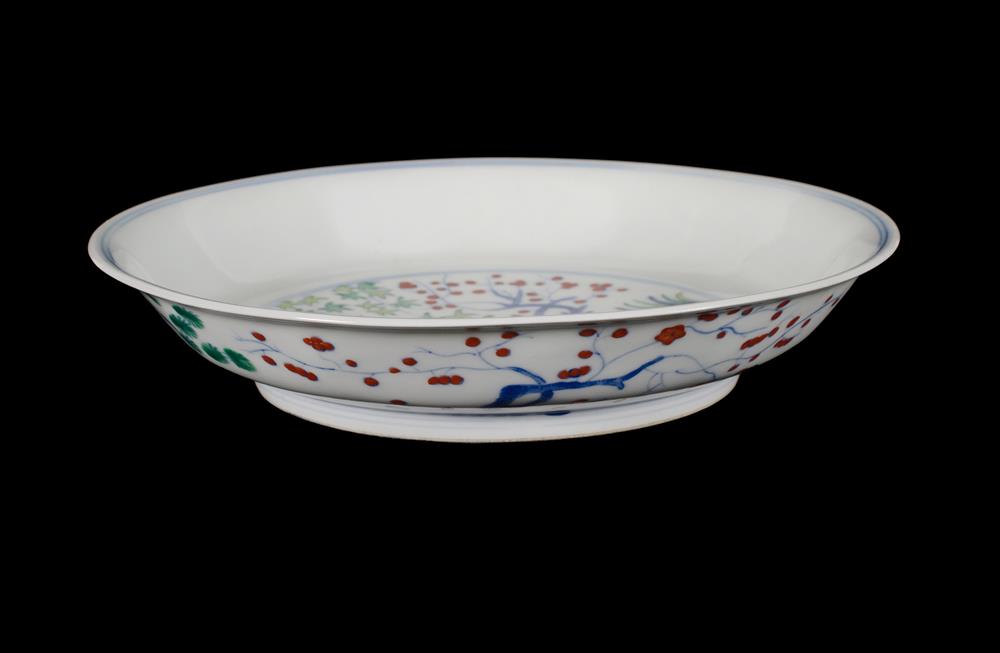 Chinese Porcelain Shallow Dish. Ducai decoration of the 'Three Friends of Winter.' Apocryphal Kaishu mark to base. (Dia 21cm) Estimate $100-200