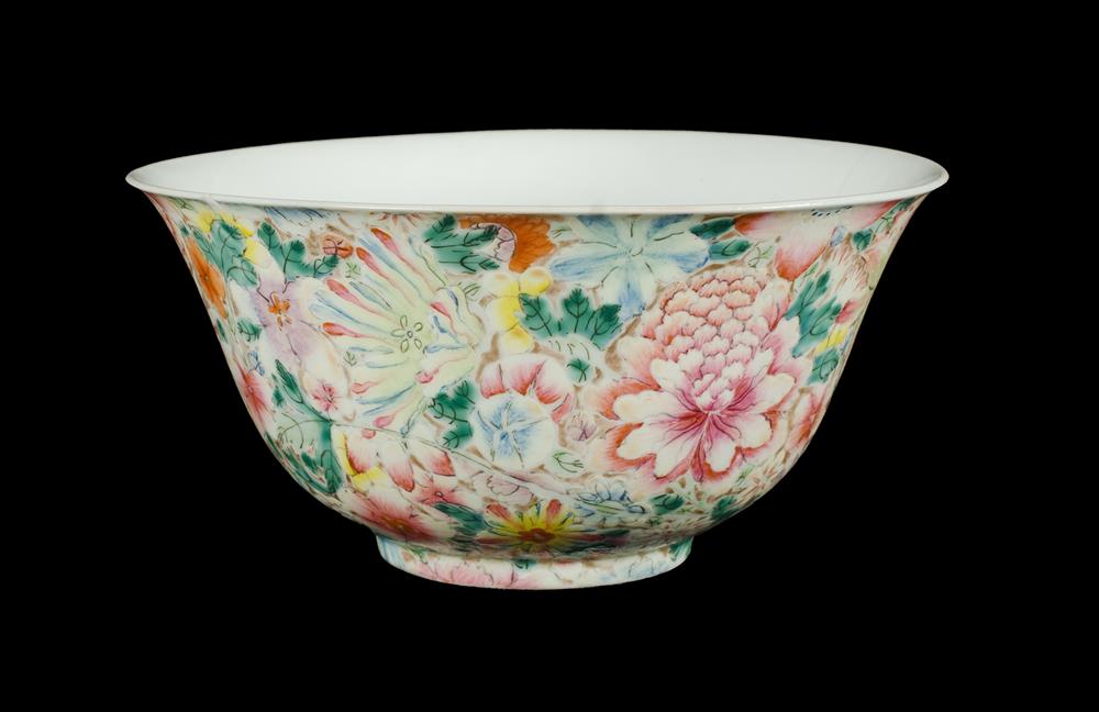 Chinese Porcelain Millefiori Bowl. With everted lip. Raised on circular foot. Four character mark to base. Hairline crack. (H8.5cm Dia 17cm) Estimate $80-150