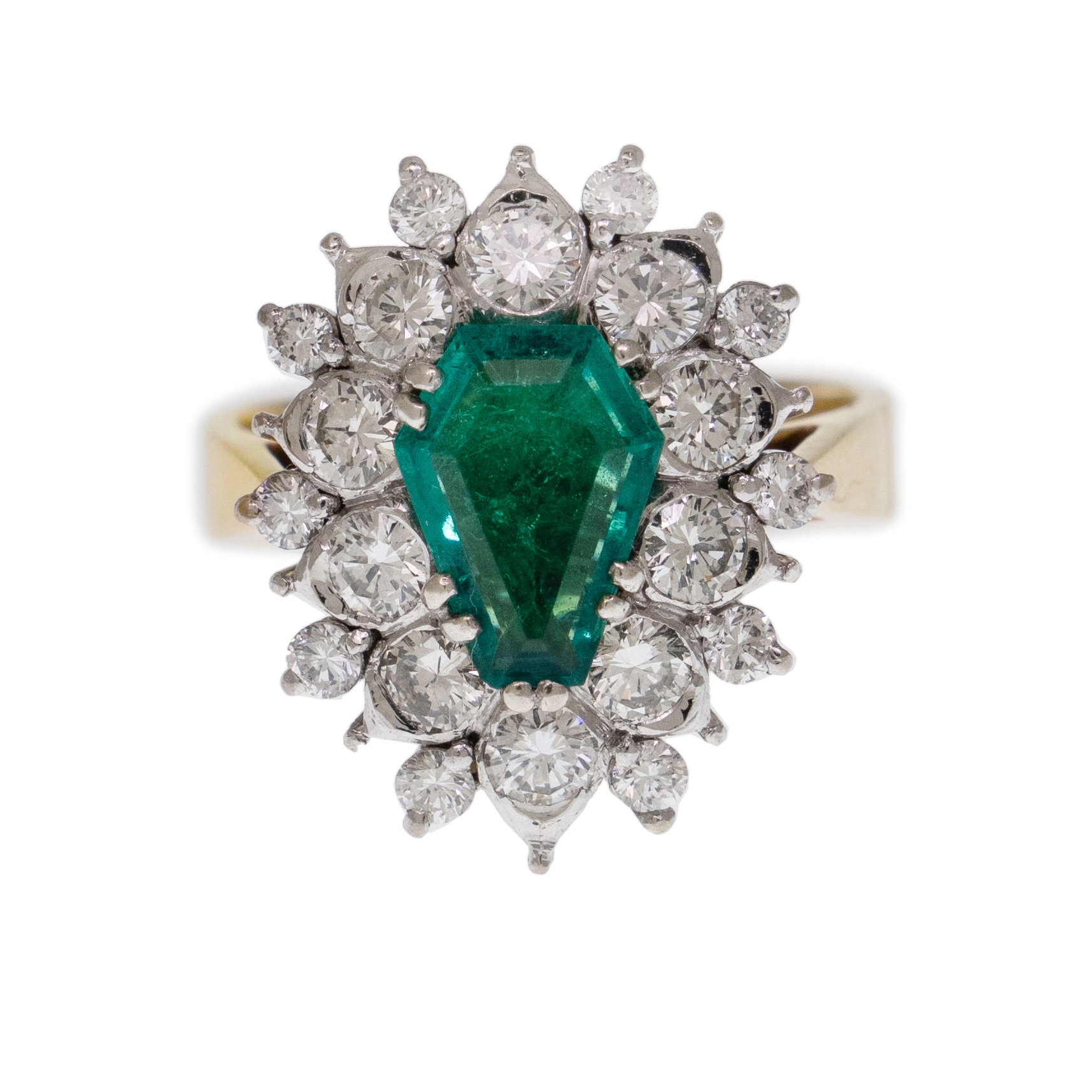 18ct Gold Emerald & Diamond Set Dress Ring. Emerald approx. 1.3ct (modified kite cut); double-row diamond surround (total approx 1.6ct). Size 58.5/Q-R. Accompanied by certificate of valuation (Symmetry) (W8.64g)Estimate $4,000-6,000