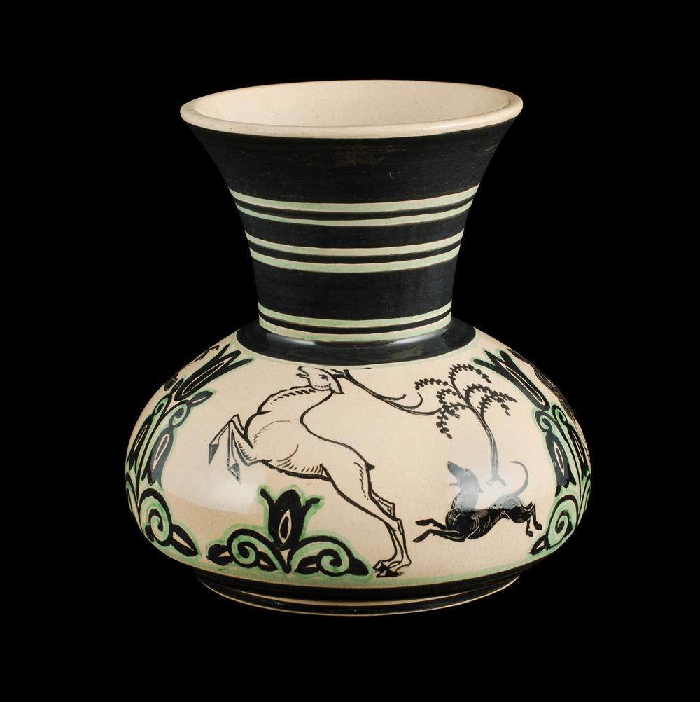 Art Deco Earthenware Vase - Waisted Baluster Form. Decorated with black silhouette classical figures & animals. Insised 'E.V.K. 1935' to base. (H19cm) Estimate $120-180