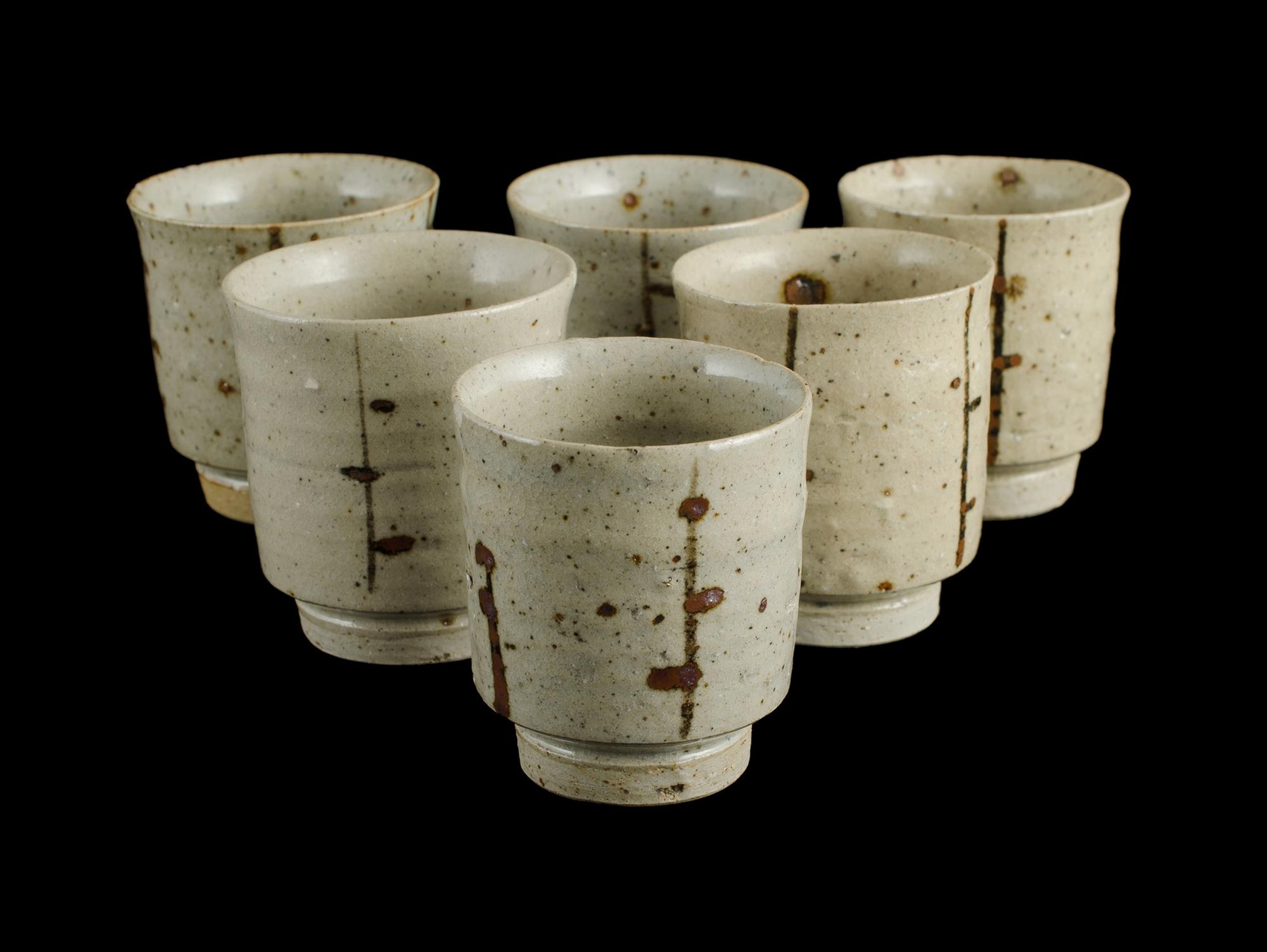 Robert Mair Stoneware Saki Bottle. With six matching cups. Impressed 'RM' studio mark to foot. H18cm (bottle)Estimate $50-100