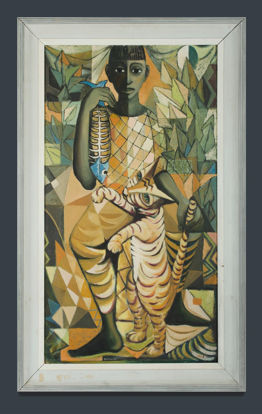 COLSEY, Dennis Cooper Native Girl with Tiger Cub & Fish, 1960. Oil on Board 95.5x52cm PROVENANCE: Old storeroom collection of an accumulator generalist. Estimate $150-300