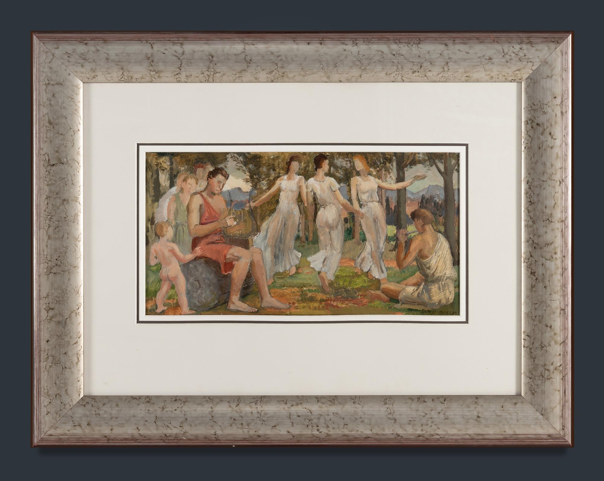 DUNDAS, Douglas Robert (1900-1981) Spring - Study for a Mural,' 1937. Sketch for the SS Westralia mural depicting the four seasons. The other three sketches are in collection of Ballarat Fine Art Gallery. The mural was completed in 1948; however the ship was later broken up for scrap, and the murals no longer survive. Oil on Board 23.5x45.5cm