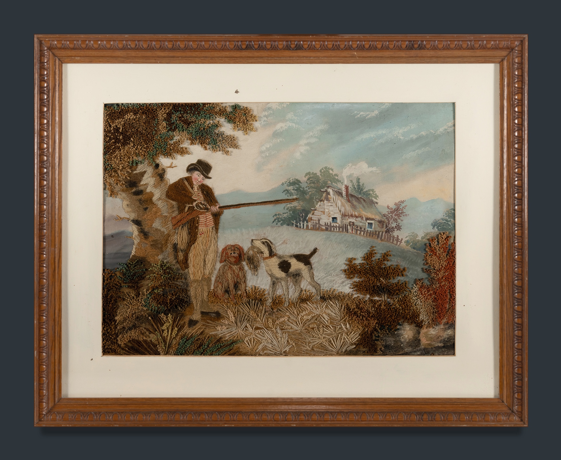 Berlin Wool Work with Painted Background. Early Hunting Scene. Wool & Gouache on Fabric 36x50.5cmEstimate $150-300