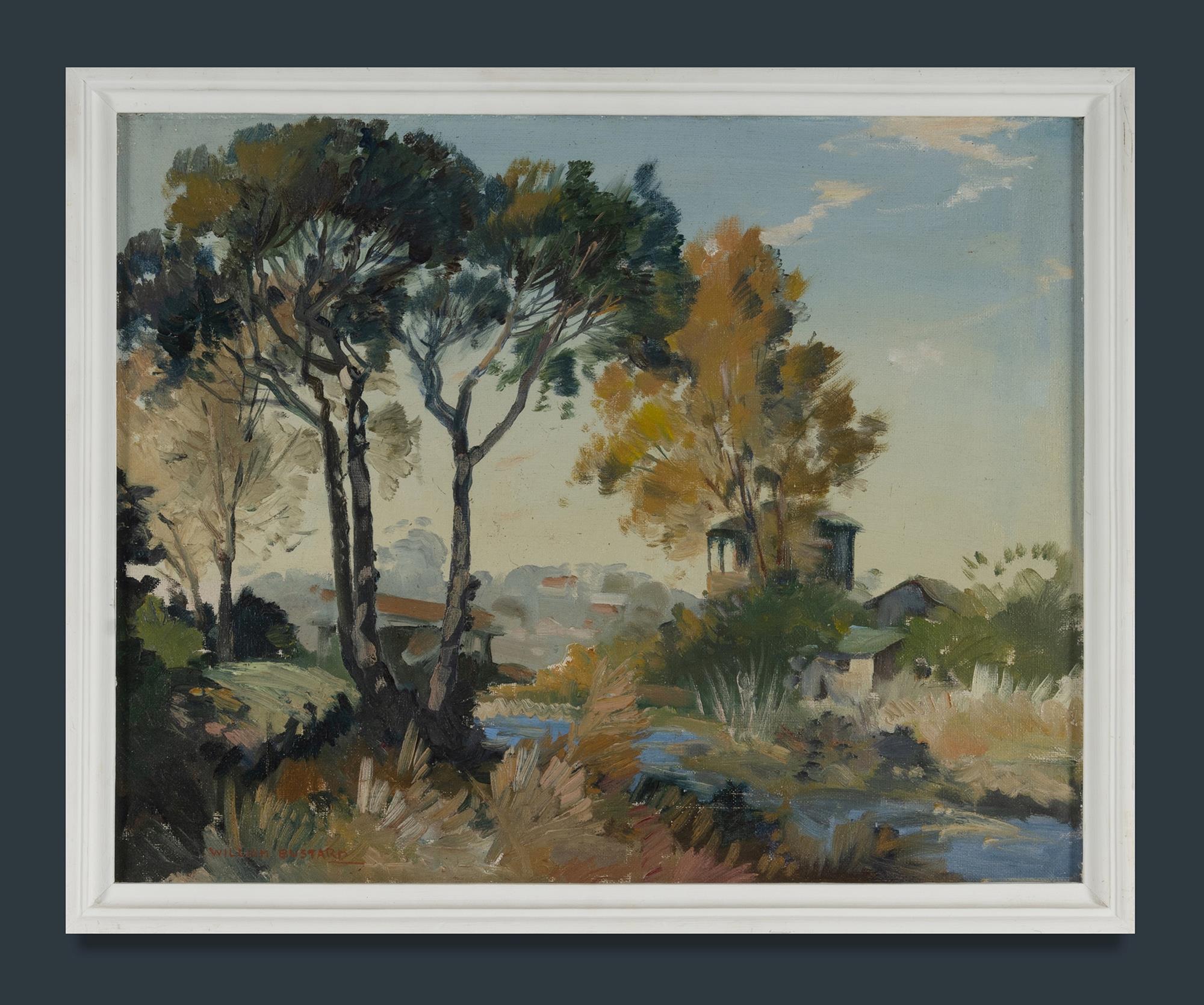 BUSTARD, William (1894-1973) Suburban Stream Oil on Canvas on Board 39x49cm PROVENANCE: Private collection, Melbourne.Estimate $500-800