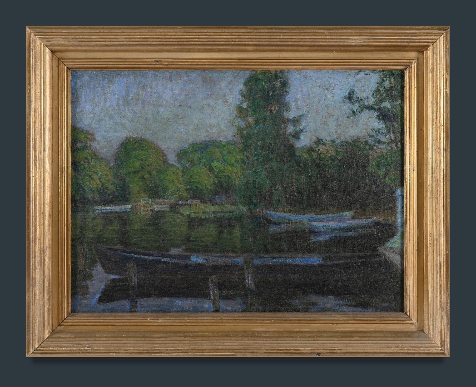 KNORR, Friedrich (German 1872-1936) 'Eutiner Stadtbucht (Eutin City Bay)' circa 1905. Exhibited: 'Nordwestdeutsche Kunstausstellung (Northwest German Art Exhibition),' Oldenburg City Art Gallery & Museum, 1905 - cat #61 (label attached verso). Provenance: Sotheby's, Melbourne, 19th April 1993 (lot 167); Bonhams, Sydney, 10th June 2020 (lot 54). Oil on Linen 52x71.5cmEstimate $800-1,500