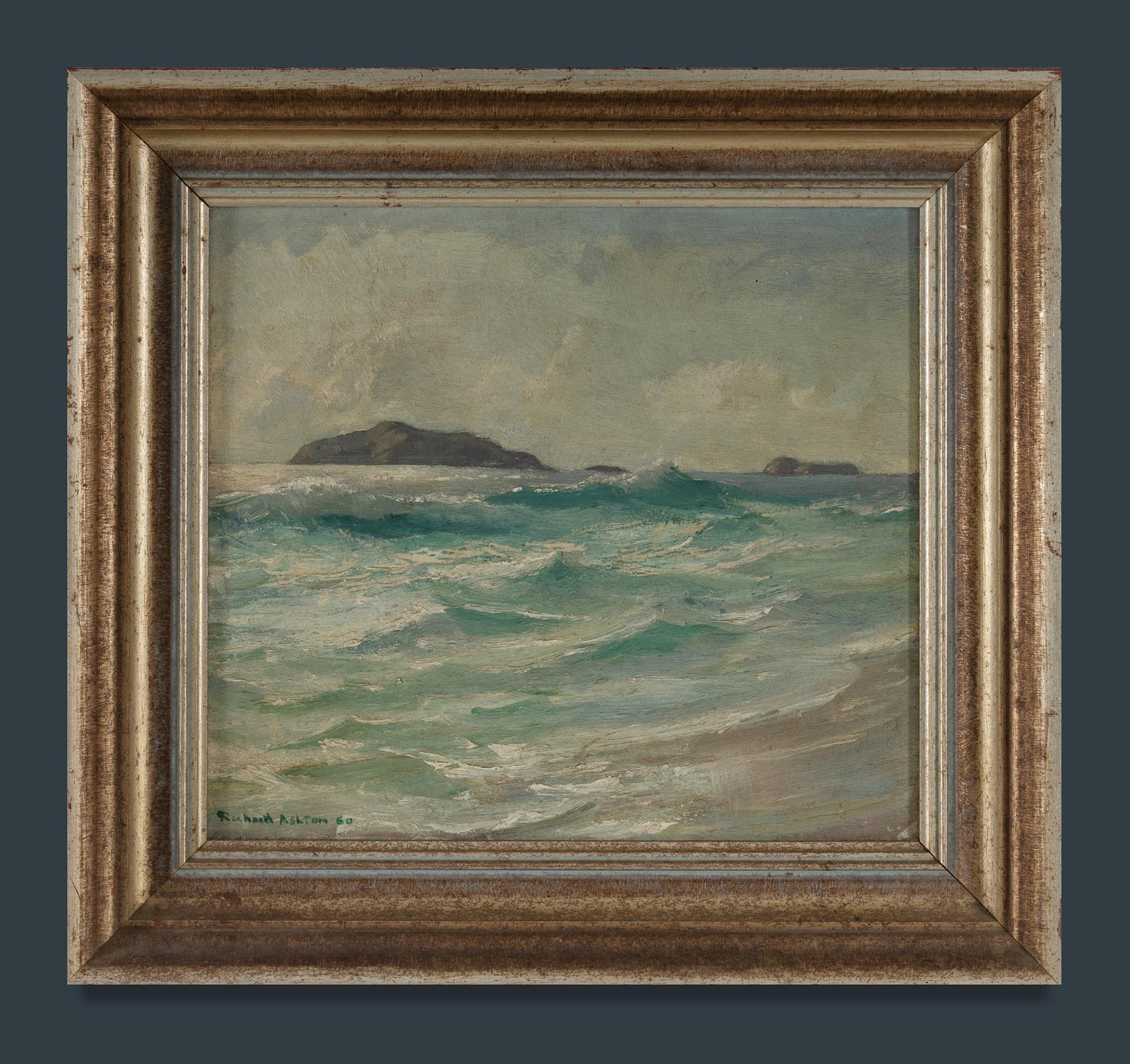 ASHTON, J Richard (1913-2001) 'Seascape, Hawknest, Port Stephens,' 1960. Oil on Canvas on Board 29x33cmEstimate $300-500