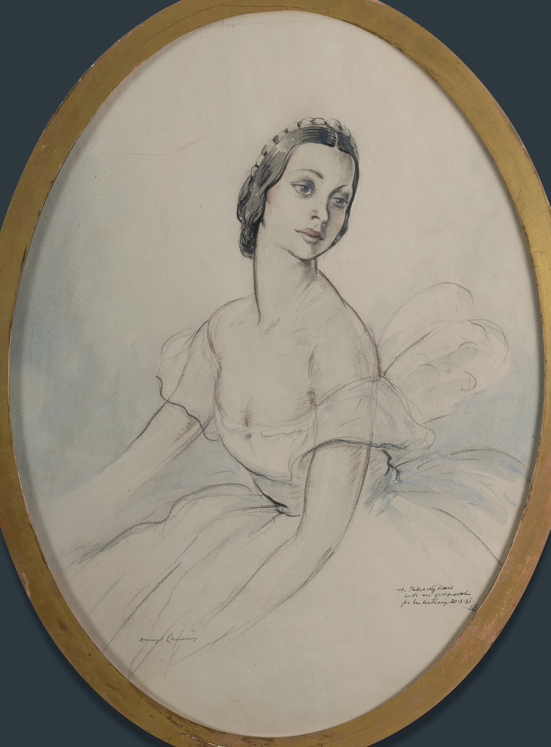 LINDSAY, Daryl (1890-1976) Vera Nemchinova un 'Les Sylphides' Gift inscription from the artist dated 20th March 1938. Pencil & W/Clr 39x29cm (oval) PROVENANCE: Sir Laurence Street; thence by descent, private collection, Sydney.Estimate $500-800
