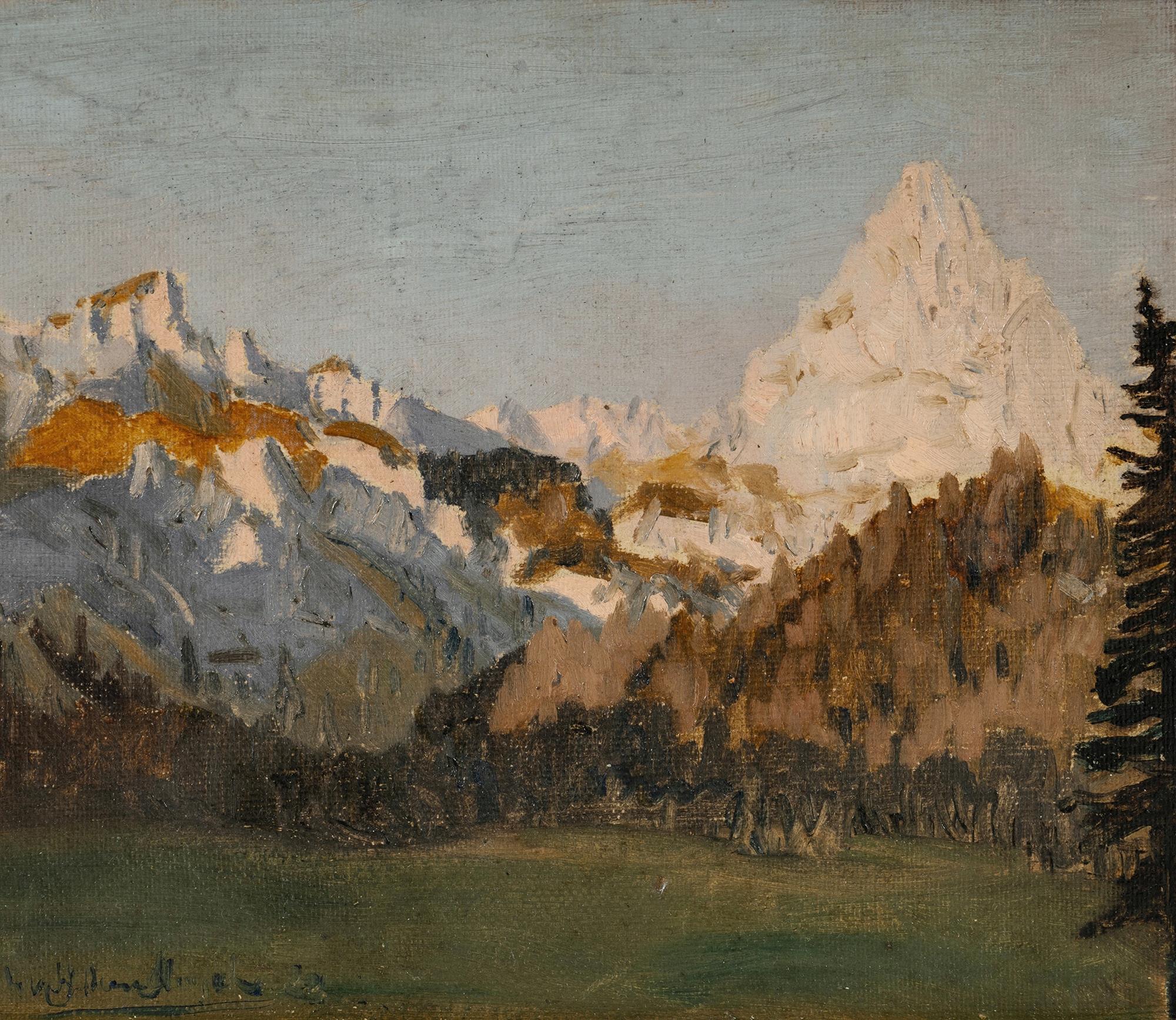 VON HILLERN-FLINSCH, Wilhelm (German 1884-1986) (2) 'Der Geiselstein Bei Fussew (?),' 1992, oil on canvas on board (24x29cm); & Alpine Scene, oil on board (19.5x12cm). Both inscribed verso.Estimate $400-800