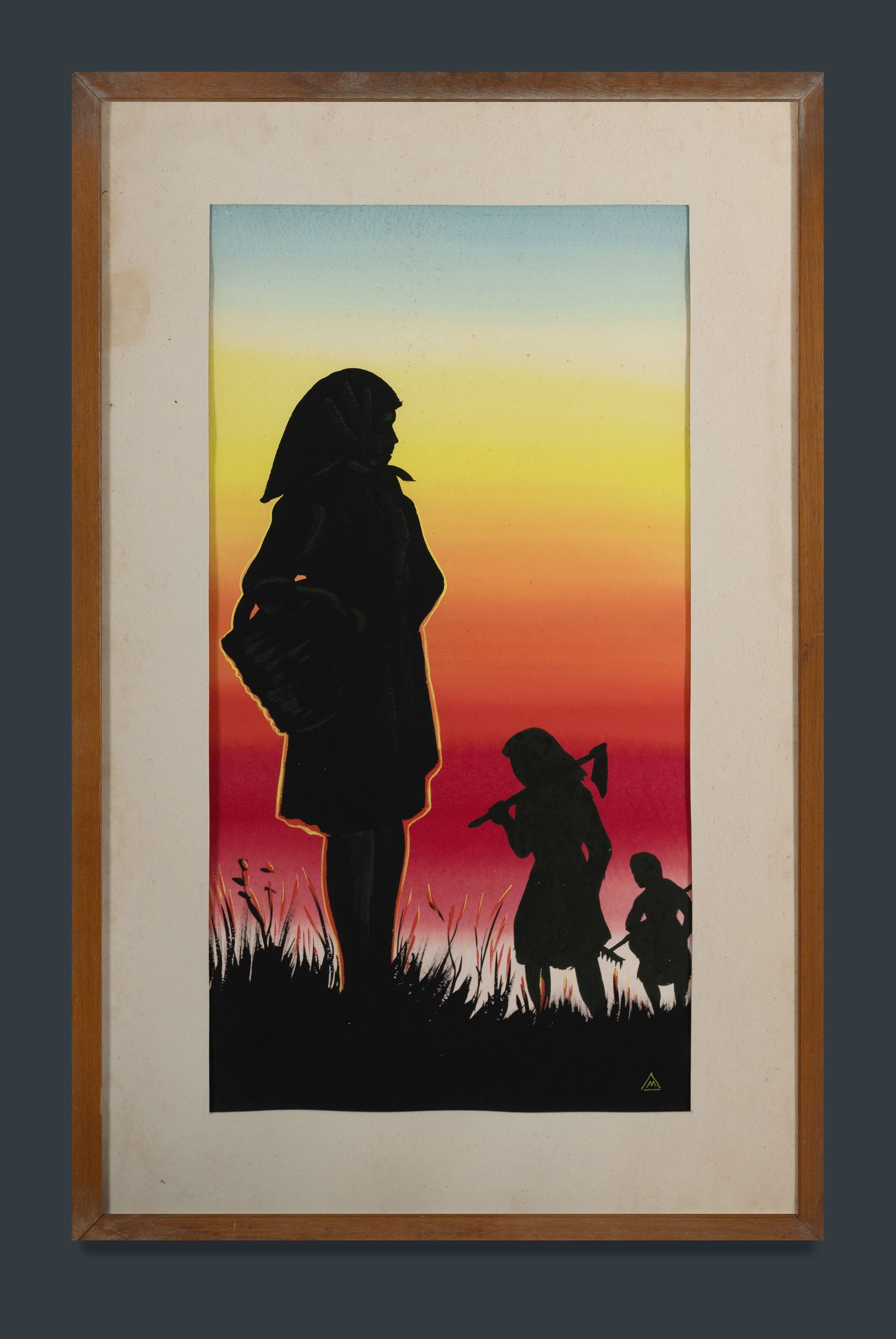 Eastern European School, Communist Era Scene of Workers Silhouetted in a Field Triangle with 'M' device lower right (or possibly 'MA' monogram), Mixed Media on Paper 64x34cmEstimate $70-120