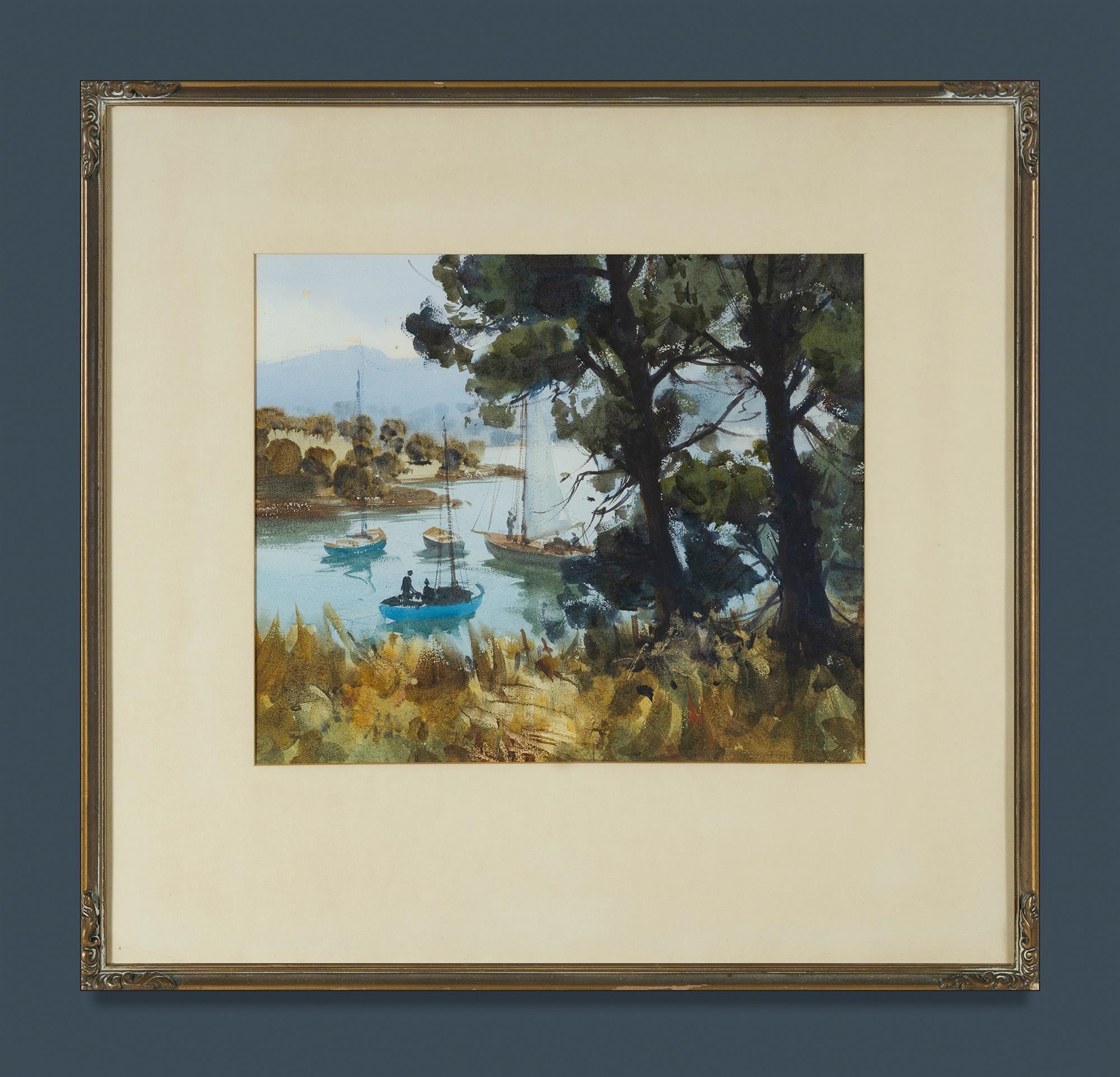 LOXTON, John S (1903-1969) 'Moorings at Bellerive (TAS)' Old labels verso. Provenance: private collection, Tasmania. W/Clr 31x37cmEstimate $400-700
