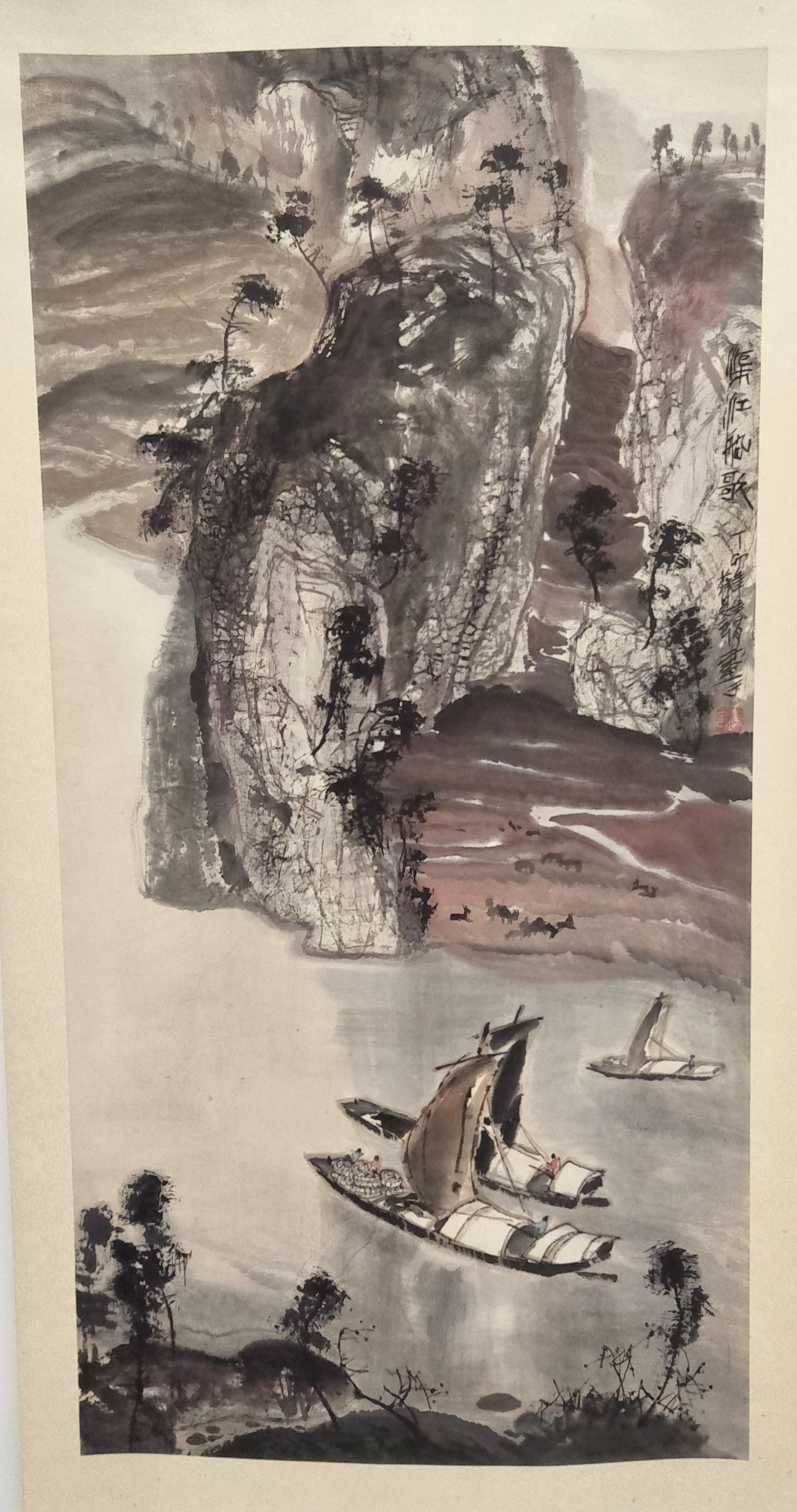 Artist Unknown, Chinese School Mountainous River Landscape with Sampan Boats Signed in ink and with artists seal. W/Clr & Ink 136x68cmEstimate $300-600