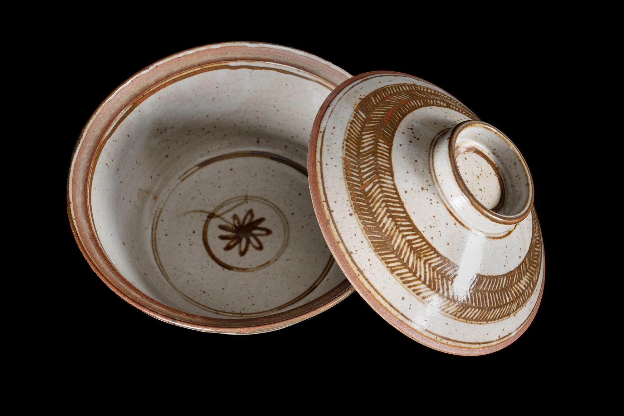 HANSSEN-PIGGOTT, Gwyn (1935-2013) Stoneware Lidded Casserole Dish Twin handles, ash glaze with brushed iron chevron patterns & internal floral emblem. Two impressed potter's seals above base. (Dia 26cm) Estimate $300-400