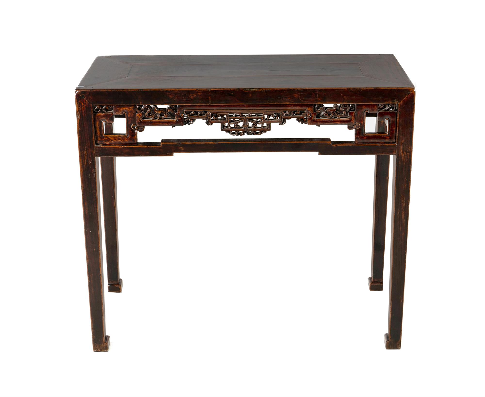 Chinese Elm Altar Table. 18th/19th C rectangular top with archaistic reticulated apron. H85cm L95cm D40cmEstimate $400-800