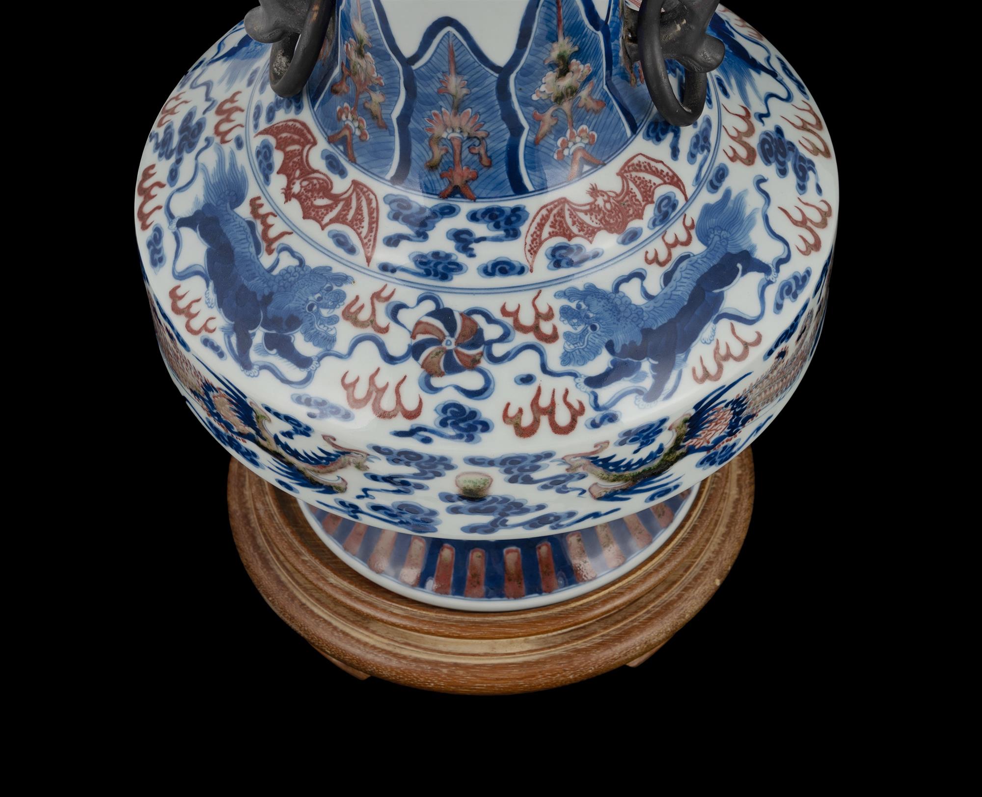 Chinese Blue & White Underglaze Red Vase. Twin handles with rings, decorated with bats, kirin & dragons. Qianlong mark to base. On wooden stand. (H36cm)Estimate $400-600
