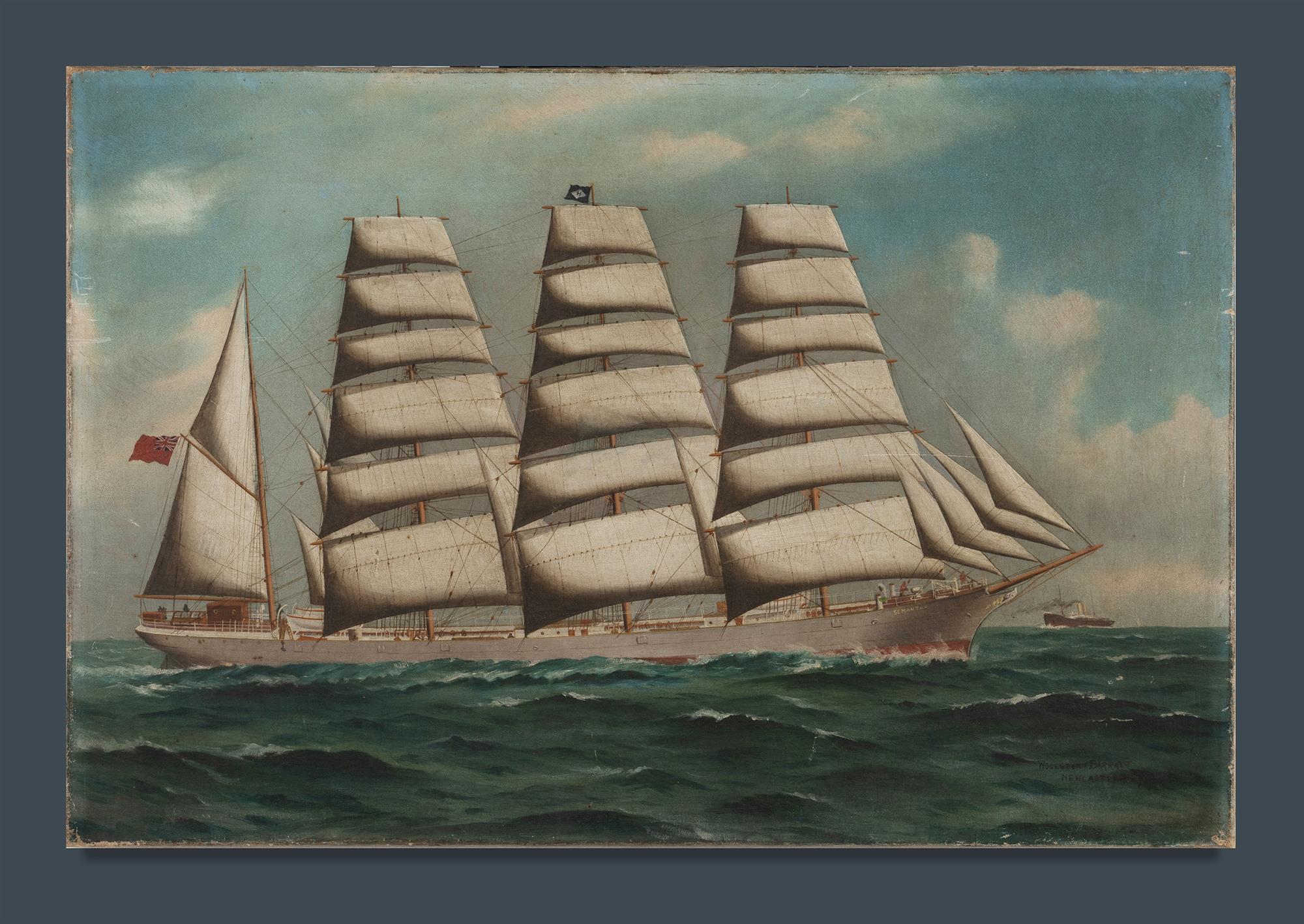 BARRATT, Walter A The 'Semantha' in Full Sail Signed/inscribed 'Woolston & Barratt, Newcastle, NSW,' (referring to the Association of George Woolston, photographer, and Walter Barrett, artist). The four masted steel barque 'Semantha' was built in 1888 by W. Hamilton & Co. Glasgow, & registered in Liverpool (UK). It was sunk by the German vessel 'Kronprinz Wilhelm' in the Atlantic in February 1915. Oil on Canvas 51x77cm Estimate $800-1,500