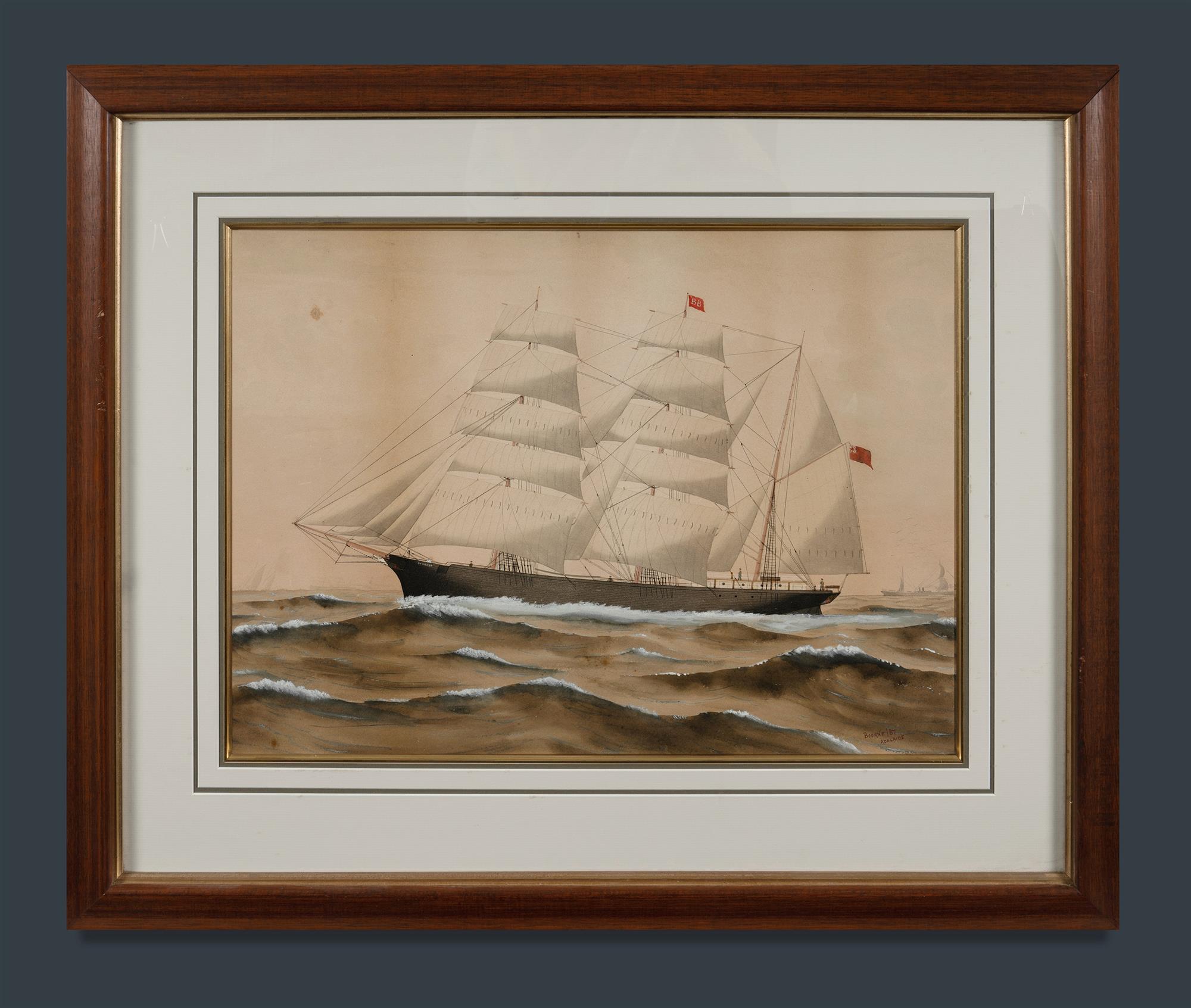 BOURNE, George W R (1858-1910) Portrait of the Ship 'Empreza,' 1887. The barque 'Empreza' was built in 1865 in Glasgow. It was scuttled in NZ in 1948. W/Clr with White Highlights 41x56.5cmEstimate $700-1,200