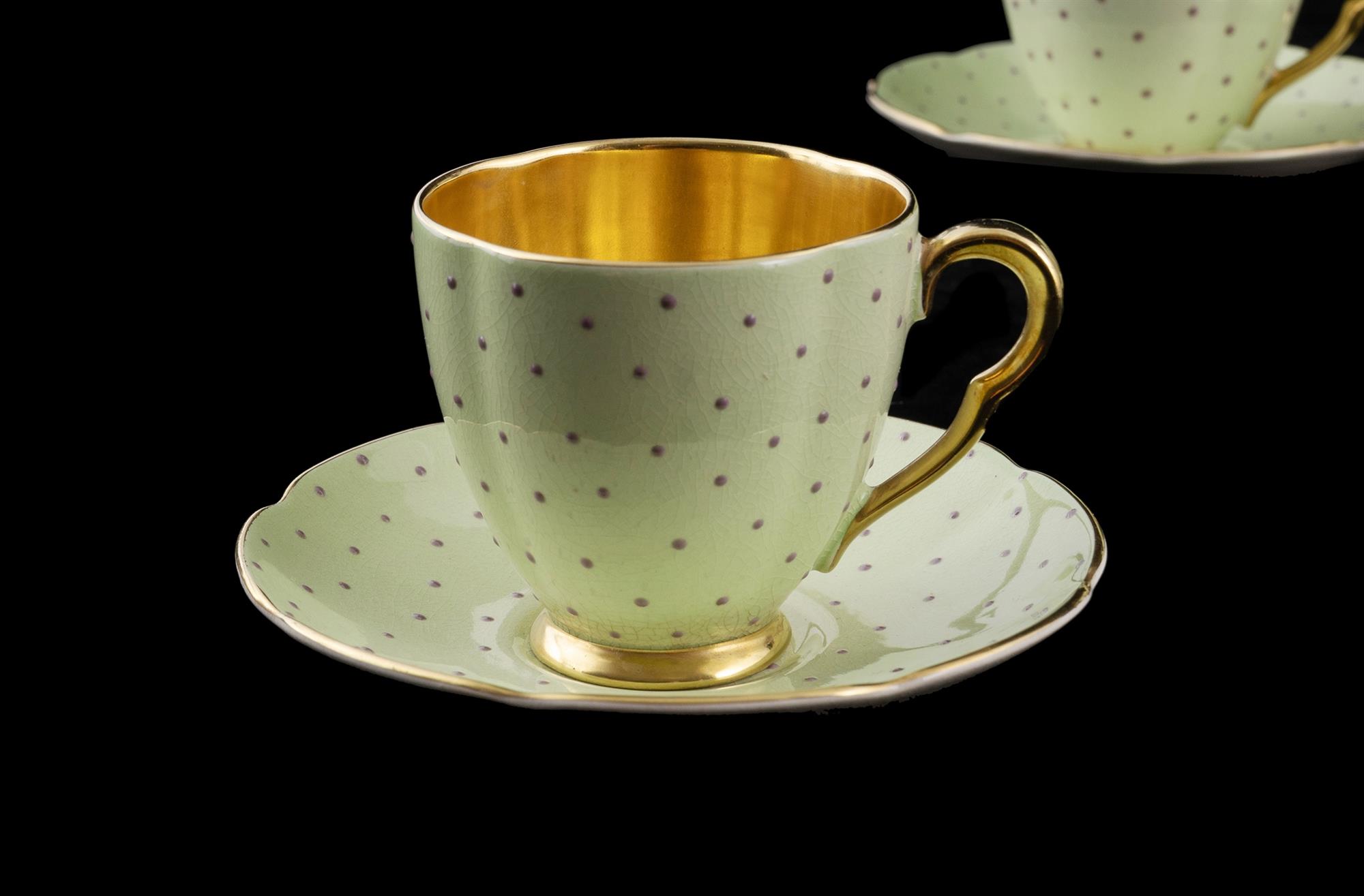 Carlton Ware Polka Dot Coffee Service Green with purple polka dots & gilt interior. Provenance: Deceased Estate, Sydney.Estimate $120-240