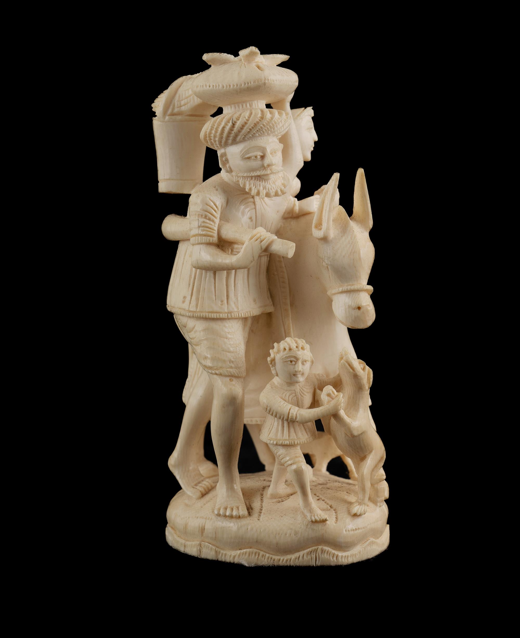 Early 20th Century Indian Ivory Carving Family figure group depicting a man, together with his wife riding a donkey. NB: ivory export restrictions. (H13cm) Provenance: Deceased Estate, Sydney.Estimate $300-600