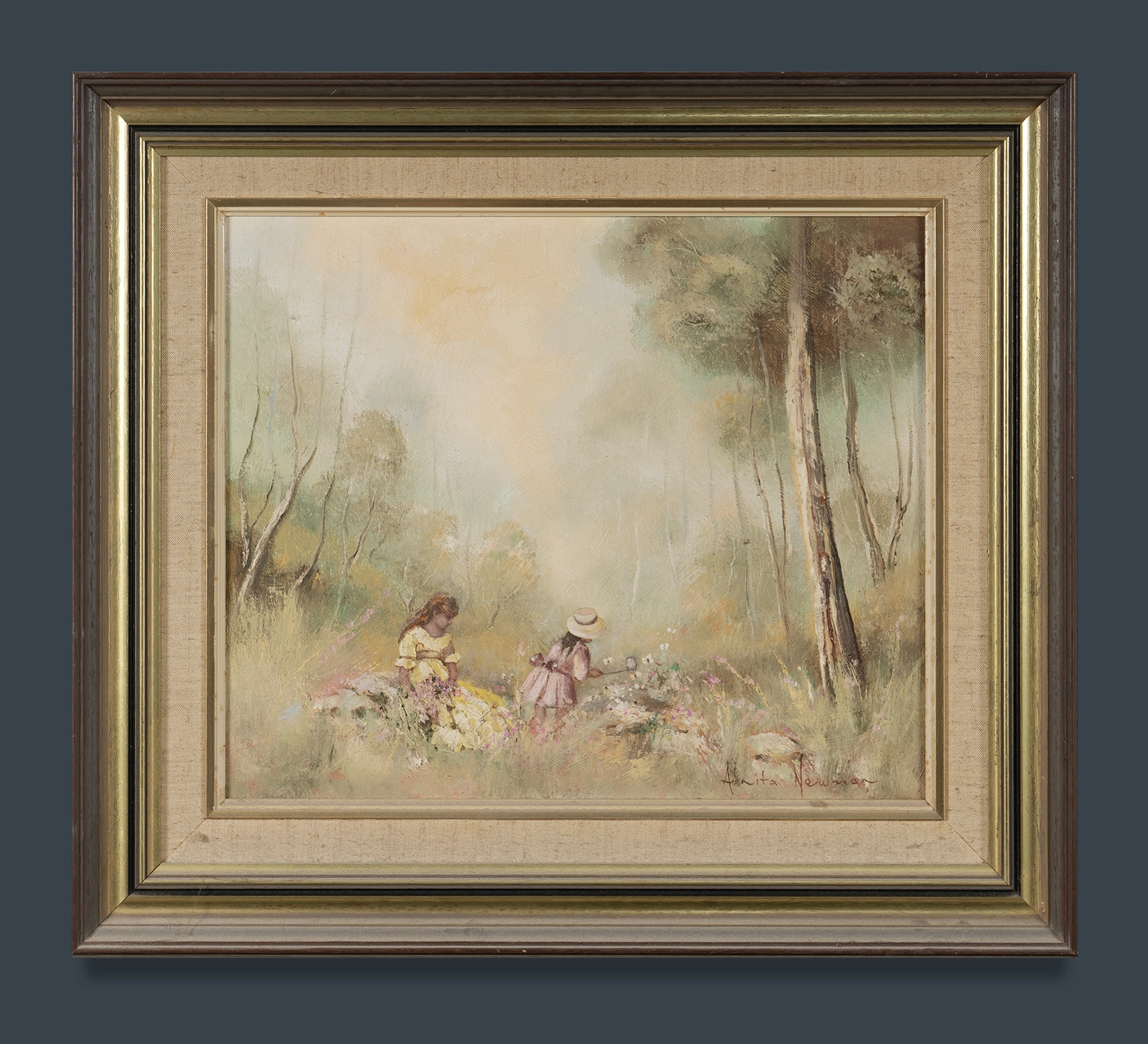NEWMAN, Anita (b. 1946) 'Catching Butterflies' Oil on Canvas Board 39x46.5cm PROVENANCE: Deceased Estate, Sydney.Estimate $50-100