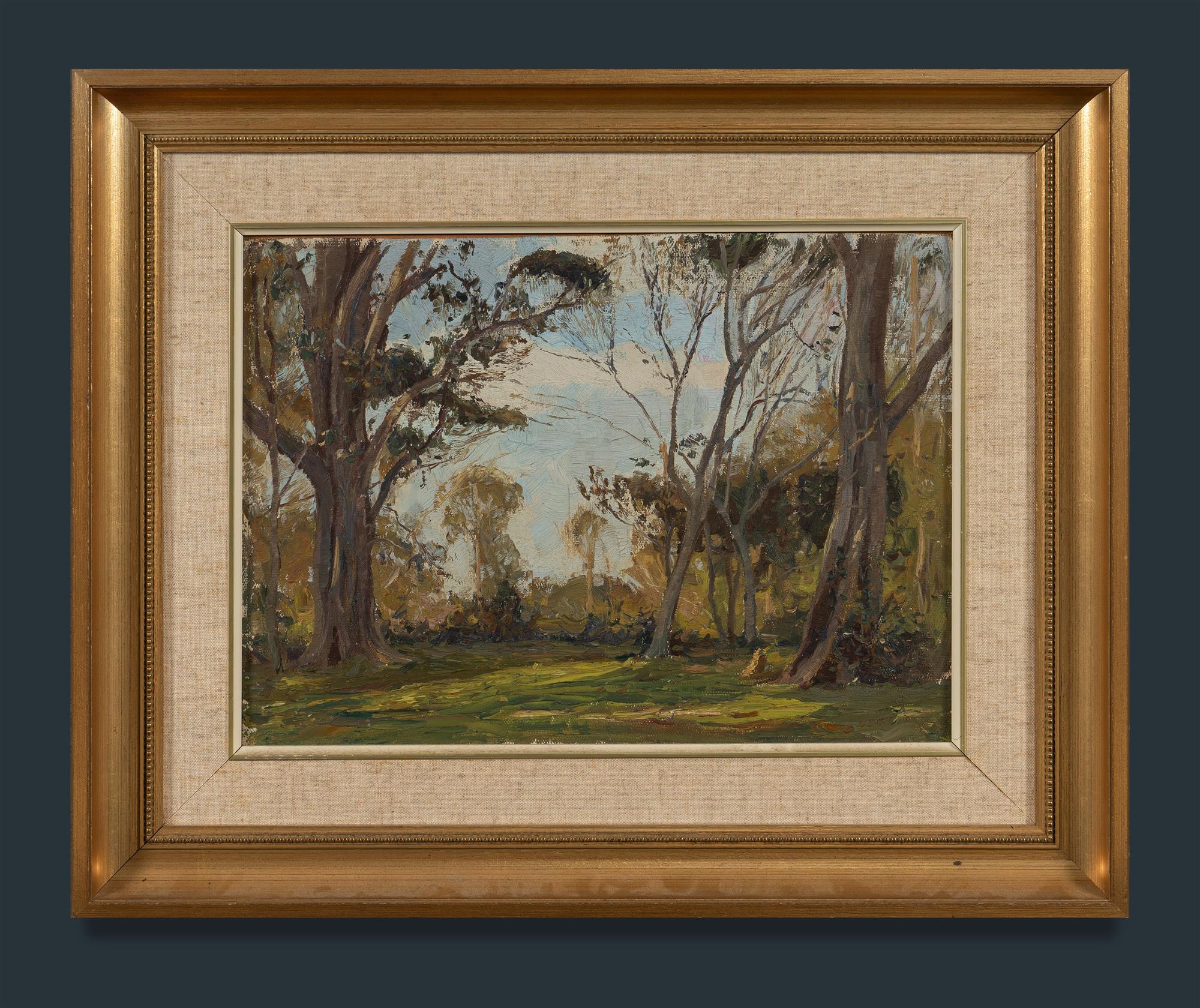 ASHTON, Will (1881-1963) Bush Clearing Unsigned, but certified verso by the artist's son, Basil. Ex House of Berg Art Gallery (label verso). Oil on Canvas Board 27.5x37.5cm PROVENANCE: Deceased Estate, Sydney.Estimate $300-600