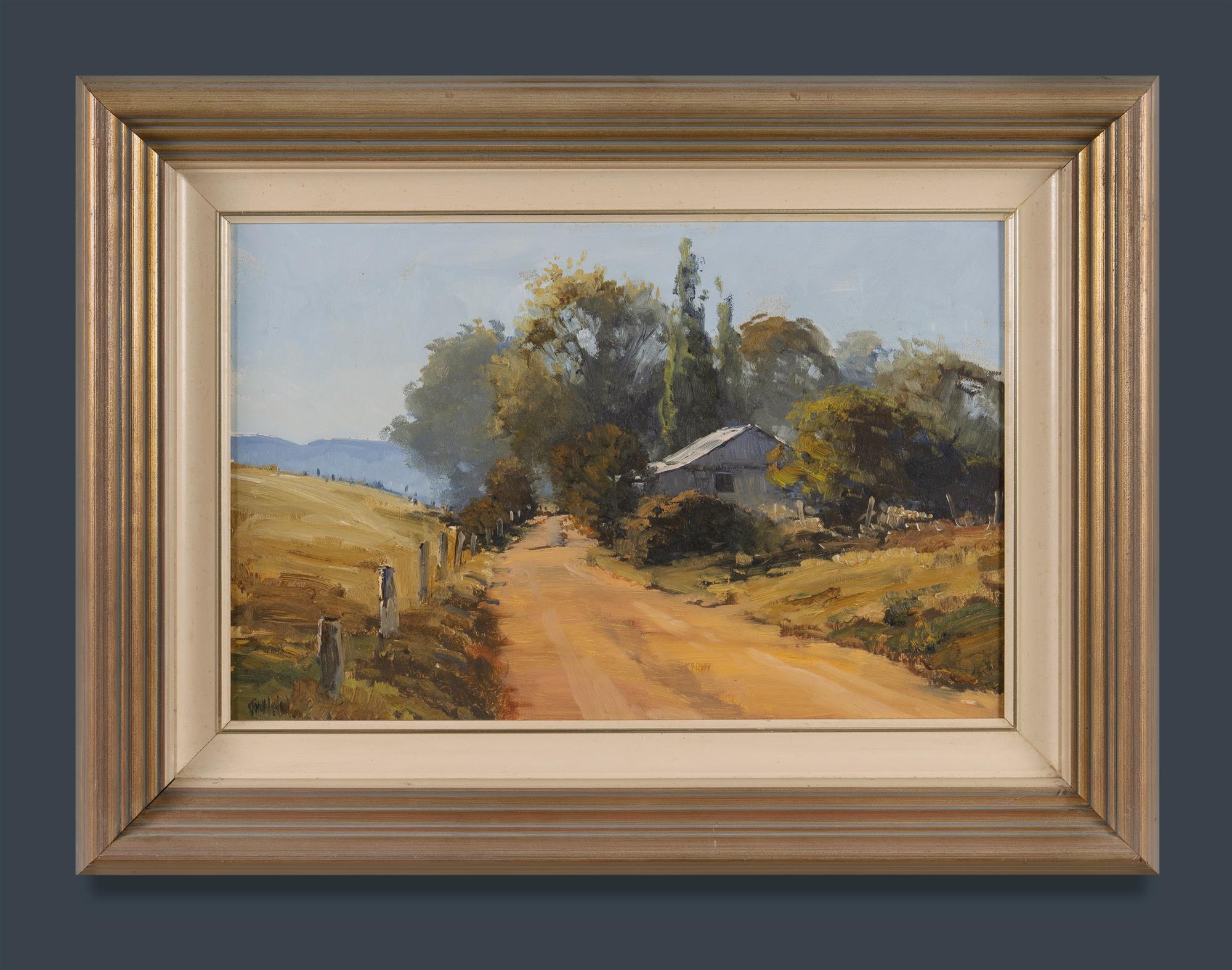 WILSON, John (1930-2021) 'Oberon Homestead' Original artist's label verso. Oil on Board 32x50cmEstimate $200-400