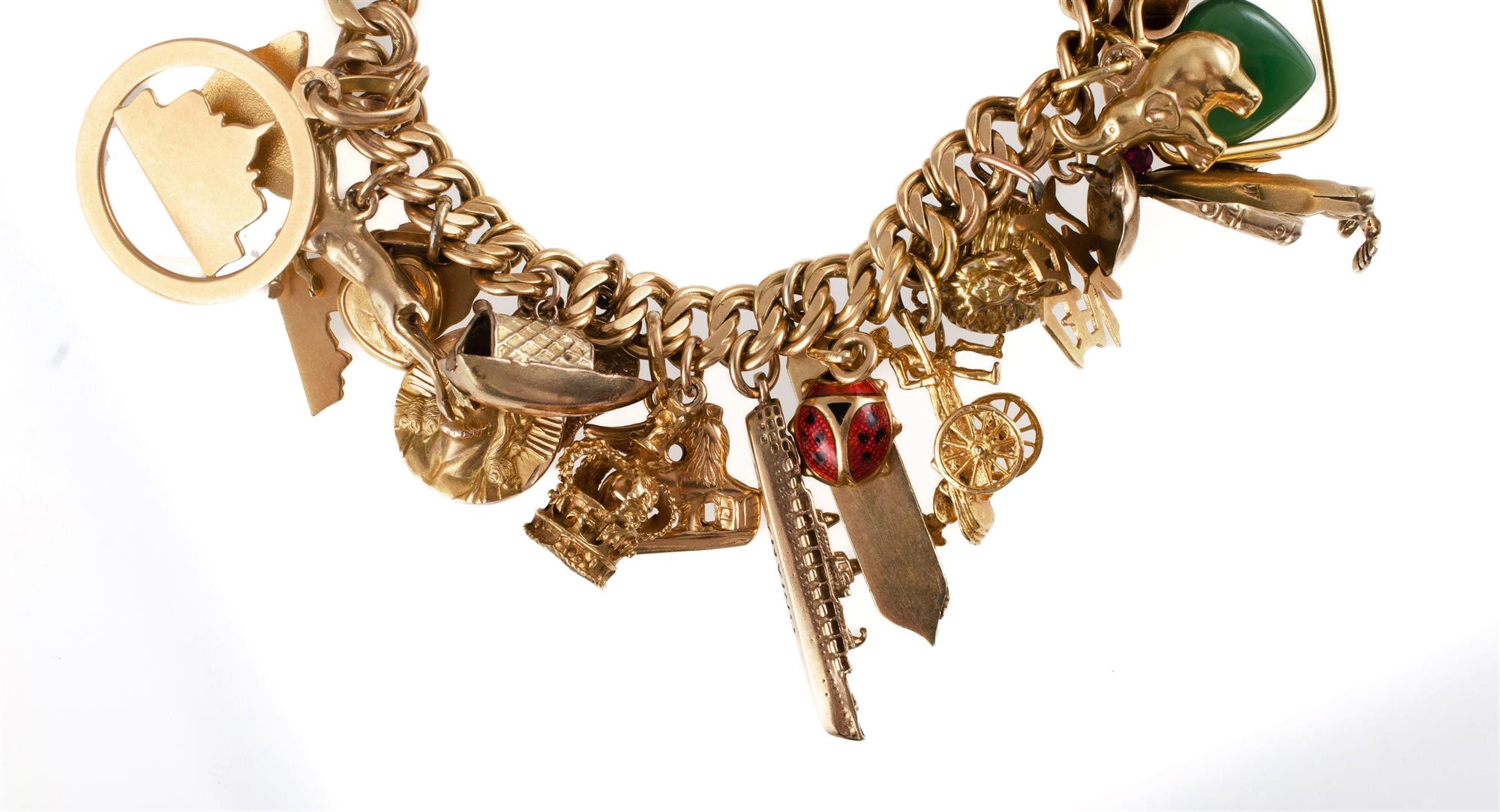 18ct Yellow Gold Charm Bracelet. Double curb link - with 34 gold charms and one other. Total weight approx. 92.5g Provenance: Deceased Estate, Sydney.Estimate $3,000-5,500