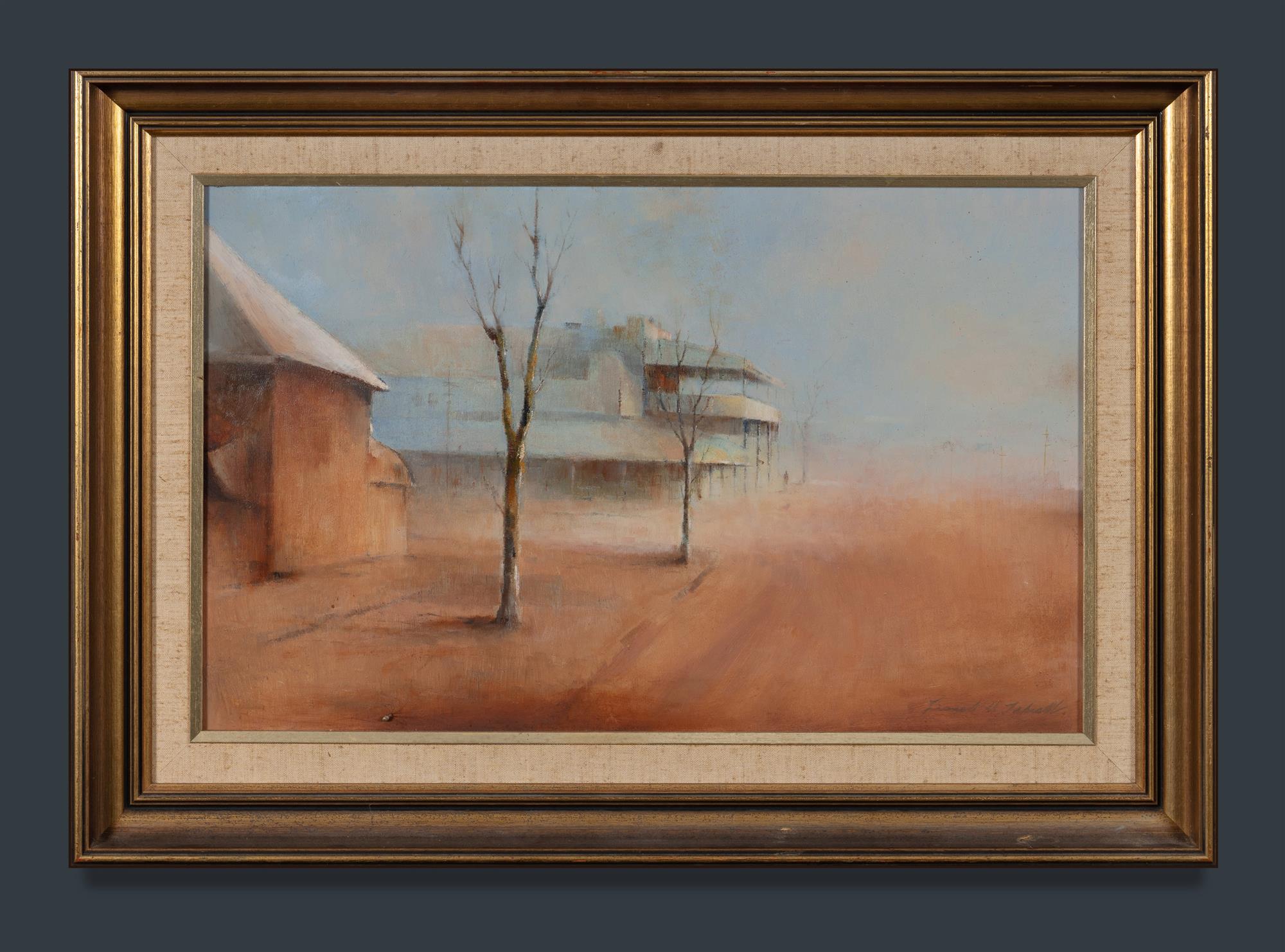 TAPRELL, Lionel H (1915-1986) Street Scene Remnants of old labels verso. Oil on Board 37x60cm PROVENANCE: Estate Late Kay Warren.Estimate $100-200